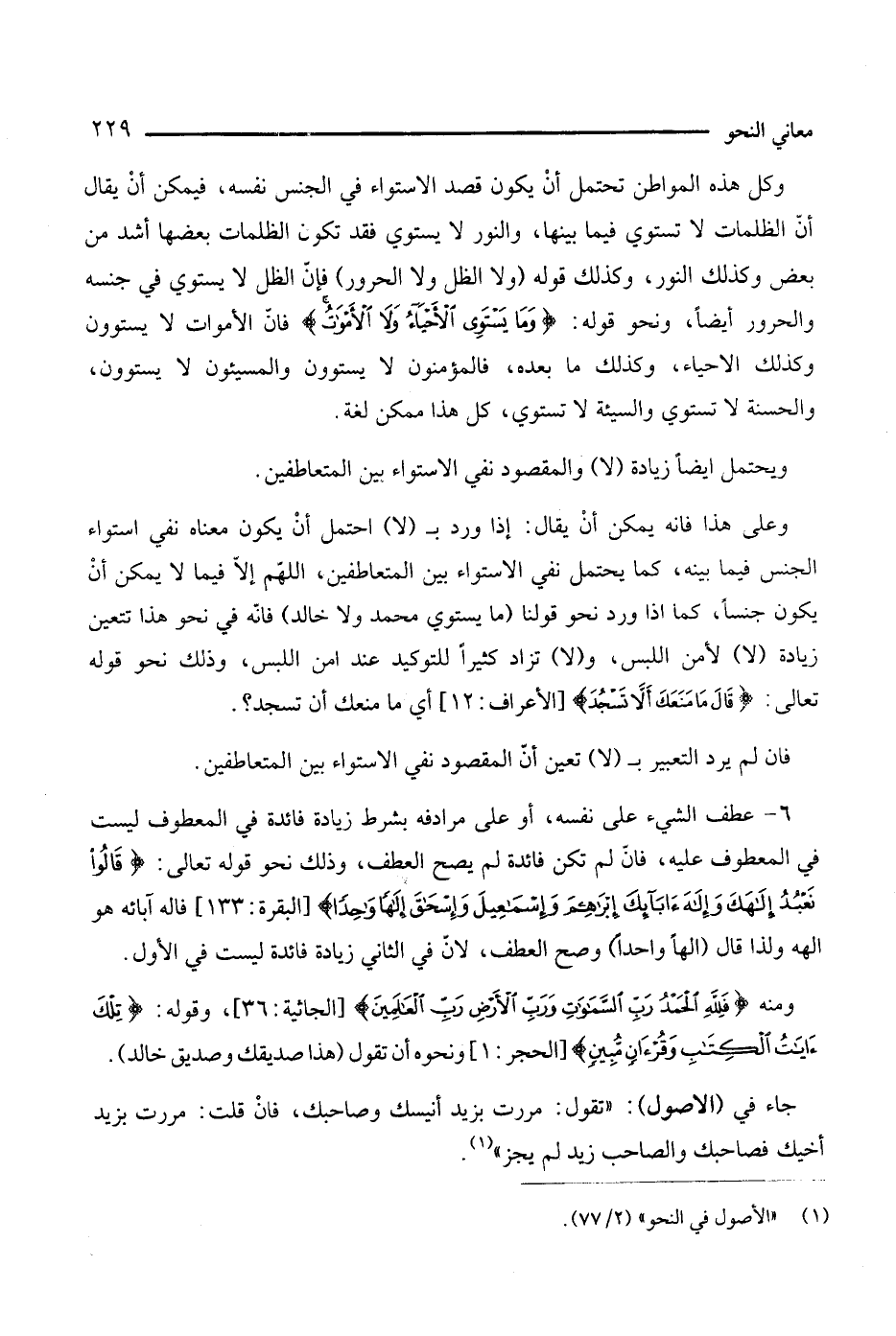 وعلى هذا فإنه يمكن أن يقال: إذا ورد بـ (لا) احتمل أن يكون معناه نفي استواء الجنس فيما بينه، كما يحتمل نفي الاستواء بين المتعاطفين، اللهم إلا فيما لا يمكن أن يكون جنسا، كما إذا ورد نحو قولنا (ما يستوي محمد ولا خالد) فإنه في نحو هذا تتعين زيادة (لا) لأمن اللبس، و (لا) تزاد كثيرا للتوكيد عند أمن اللبس، وذلك نحو قوله تعالى: {قال ما منعك ألا تسجد} [الأعراف: 12]، أي ما منعك أن تسجد؟