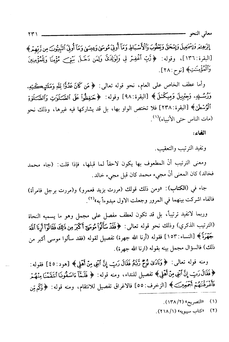 وربما لا تفيد ترتيبا، بل قد تكون لعطف مفصل على مجمل وهو ما يسميه النحاة الترتيب الذكري، وذلك نحو قوله تعالى: {فقد سألوا موسى أكبر من ذلك فقالوا أرنا الله جهرة} [النساء: 153]، فقوله: (أرنا الله جهرة) تفصيل لقوله (فقد سألوا موسى أكبر من ذلك) فالسؤال مجمل بينه بقوله (أرنا الله جهرة).