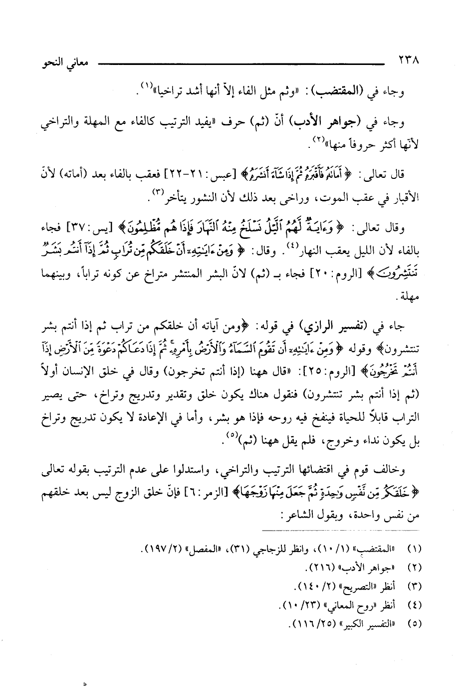 وجاء في (جواهر الأدب) أن (ثم) حرف " يفيد الترتيب كالفاء مع المهلة والتراخي لأنها أكثر حروفاً منها" (¬2). قال تعالى: {أماته فأقبره ثم إذا شاء أنشره} [عبس: 21 - 22]، فعقب بالفاء بعد (أماته) لأن الإقبار في عقب الموت، وراخي بعد ذلك لأن النشور يتأخر (¬3).