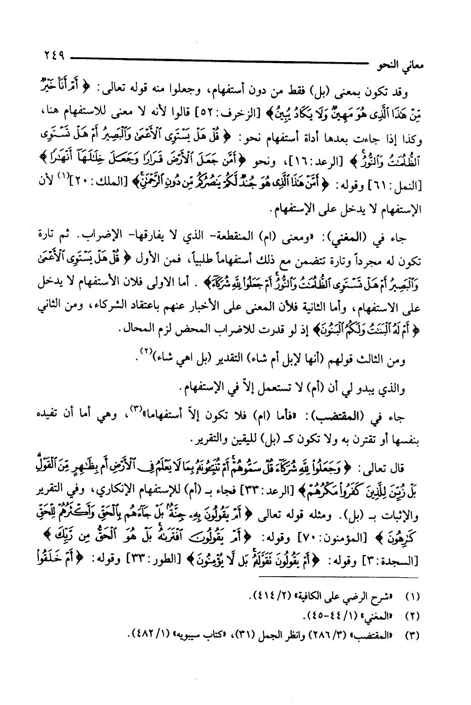 وقد تكون بمعنى (بل) فقط من دون استفهام، وجعلوا منه قوله تعالى: {أم أنا خير من هذا الذي هو مهين ولا يكاد يبين} [الزخرف: 52]، قالوا لأنه لا معنى للاستفهام هنا، وكذا إذا جاءت بعدها أداة استفهام، نحو: {قل هل يستوي الأعمي والبصير أم له يستوي الظلمات والنور} [الرعد: 16]، ونحو: {أمن جعل الأرض قرارا وجعل خلالها أنهارا} [النمل: 61]، وقوله: {أمن هذا الذي هو جند لكم ينصركم من دون الرحمن} [الملك: 20] (¬1). لأن الاستفهام لا يدخل على الاستفهام.