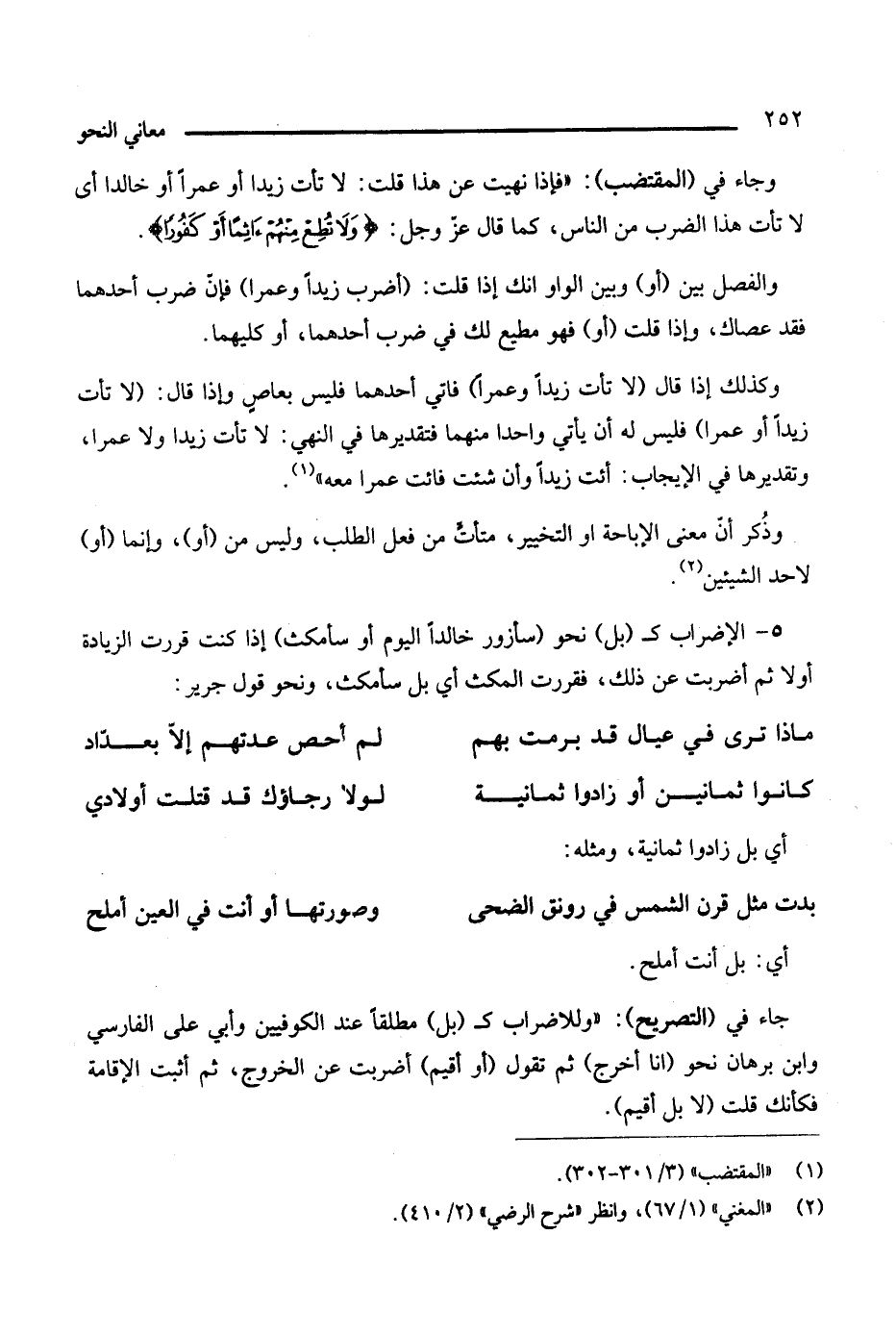 وجاء في (المقتضب): " فإذا نهيت عن هذا قلت: لا تأت زيدا أو عمرا، أو خالدا أي لا تأت هذا الضرب من الناس، كما قال عز وجل: {ولا تطع منهم آثما او كفروا}.