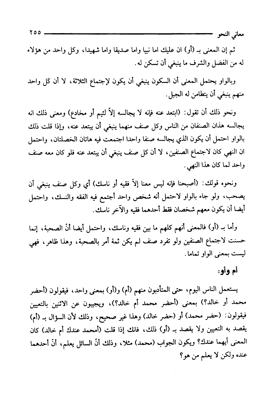يستعمل الناس اليوم، حتى المتأدبون منهم (أم) و (أم) بمعنى واحد، فيقولون (أحضر محمد أو خالد) بمعنى (أحضر محمد أم خالد)؟ ويجيبون عن الاثنين بالتعيين فيقولون: (حضر محمد) أو (حضر خالد) وهذا غير صحيح، وذلك لأن السؤال بـ (أم) يقصد به التعيين ولا يقصد بـ (أو) ذلك، فإنك إذا قلت (أمحمد عندك أم خالد) كان المعنى أيهما عندك؟ ويكون الجواب (محمد) مثلا، وذلك أن السائل يعلم، أن أحدهما عنده ولكن لا يعلم من هو؟