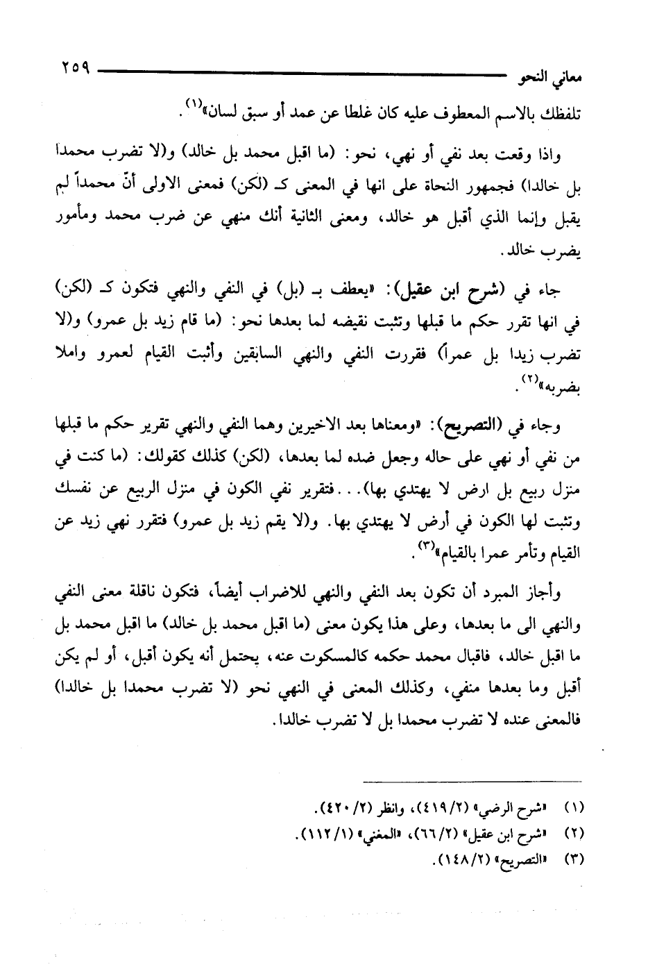 وأجاز المبرد أن تكون بعد النفي والنهي للاضراب أيضا، فتكون ناقلة معنى النفي والنهي إلى ما بعدها، وعلى هذا يكون معنى (ما أقبل محمد بل خالد) ما أقبل محمد بل ما أقبل خالد، فإقبال محمد حكمه كالمسكوت عنه، يحتمل أنه يكون أقبل، أو لم يكن أقبل وما بعدها منفي، وكذلك المعنى في النهي نحو (لا تضرب محمدا بل خالدا) فالمعنى عنده لا تضرب محمدا بل لا تضرب خالدا.