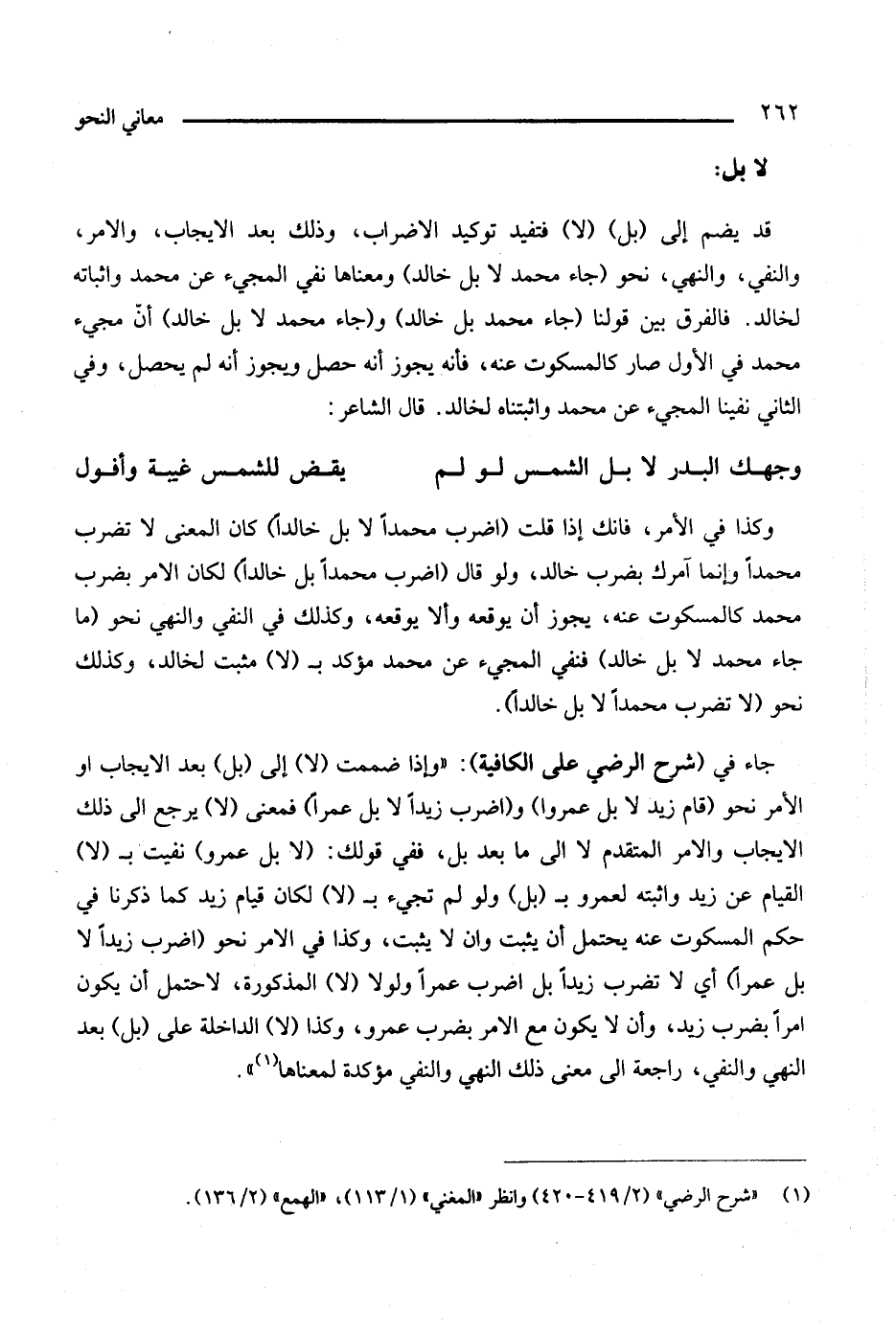 جاء في (شرح الرضي على الكافية): " وإذا ضممت (لا) إلى (بل) بعد الإيجاب أو الأمر نحو (قام زيد لا بل عمروا) و (اضرب زيدا لا بل عمرا) فمعنى (لا) يرجع إلى ذلك الإيجاب والأمر المتقدم لا إلى ما بعد بل، ففي قولك (لا بل عمرو) نفيت بـ (لا) القيام عن زيد وأثبته لعمرو بـ (بل) ولو لم تجيء بـ (لا) لكان قيام زيد كما ذكرنا في حكم المسكوت عنه يحتمل أن يثبت وأن لا يثبت، وكذا في الأمر نحو (اضرب زيدا لا بل عمرا) أي لا تضرب زيدا بل اضرب عمرا ولولا (لا) المذكورة، لاحتمل أن يكون امرا بضرب زيد، وأن لا يكون مع الأمر بضرب عمرو، وكذا (لا) الداخلة على (بل) بعد النهي والنفي، راجعة إلى معنى ذلك النهي والنفي مؤكدة لمعناها (¬1).