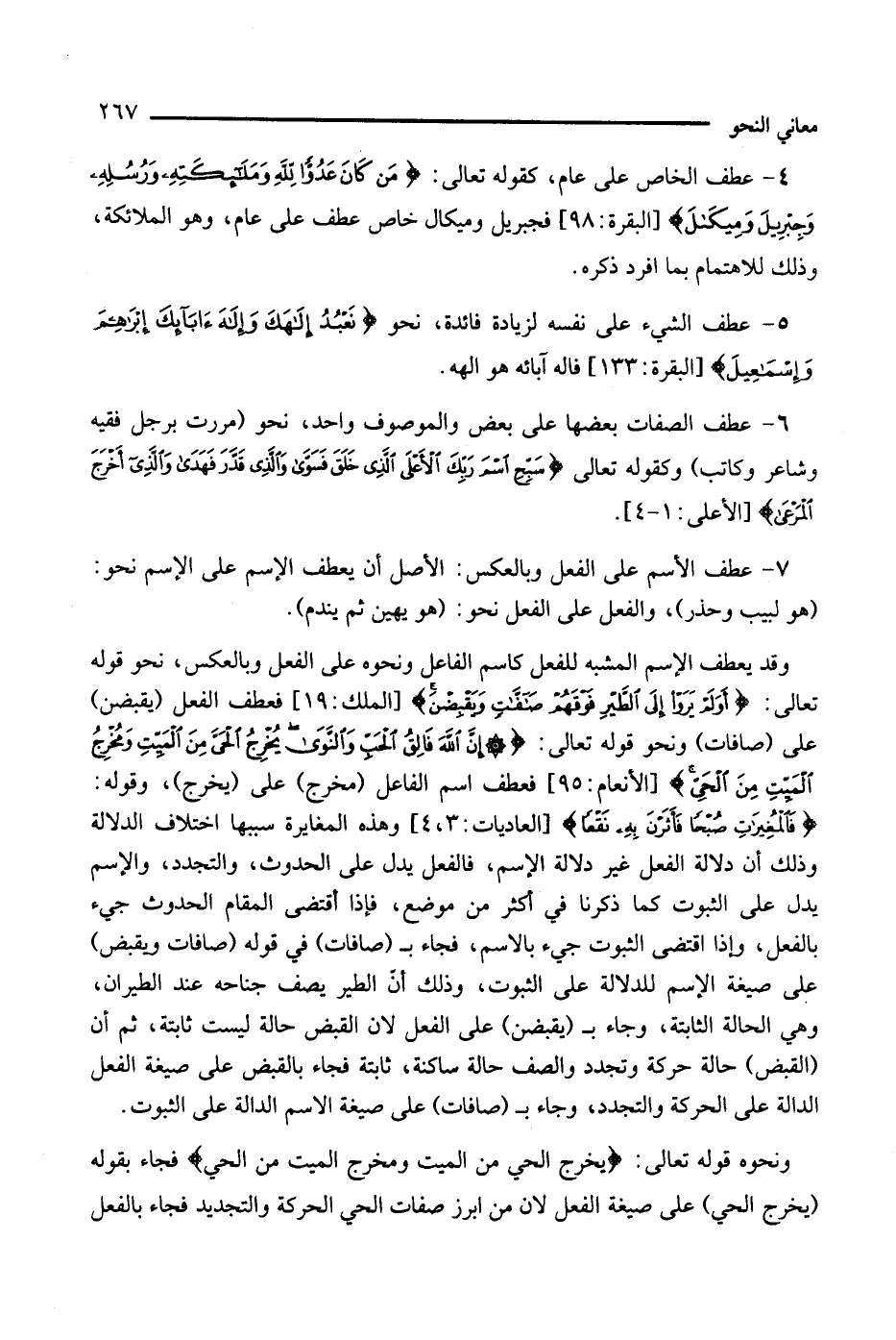 4 - عطف الخاص على عام، كقوله تعالى: {من كان عدوا لله وملائكته ورسله وجبريل وميكال} [البقرة: 98]، فجبريل وميكال خاص عطف على عام، وهو الملائكة، وذلك للاهتمام بما أفرد ذكره.