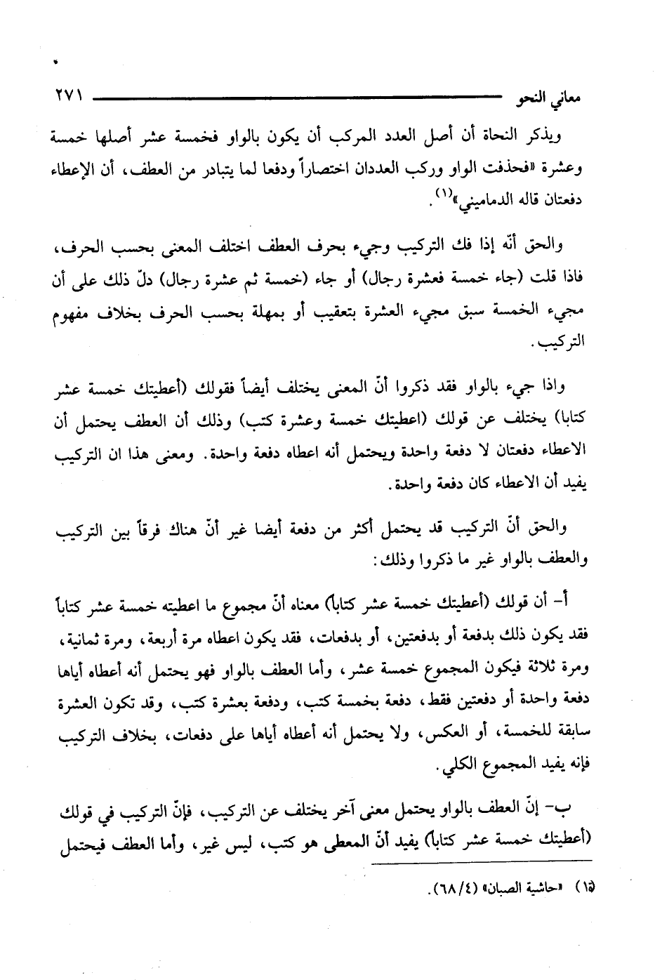 ب - إن العطف بالواو يحتمل معنى آخر يختلف عن التركيب، فإن التركيب في قولك (أعطيتك خمسة عشر كتابا) يفيد أن المعطي هو كتب، ليس غير، وأما العطف فيحتمل