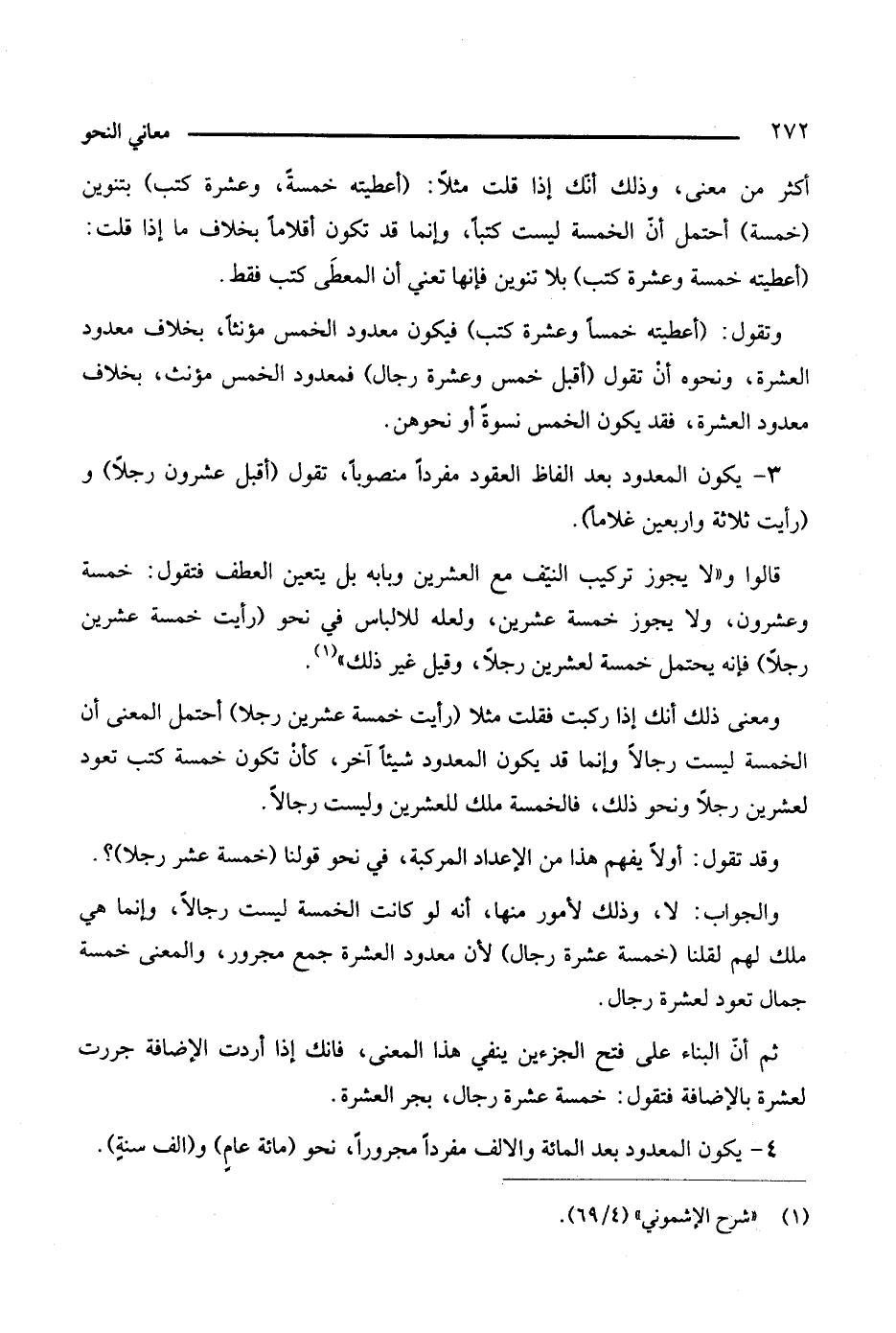 وقد تقول: أولا يفهم هذا من الإعداد المركبة، في نحو قولنا: (خمسة عشر رجلا)؟ والجواب: لا، وذلك لأمور منها أنه لو كانت الخمسة ليست رجالا وإنما هي ملك لهم لقلنا (خمسة عشرة رجال) لأن معدود العشرة جمع مجرور، والمعنى خمسة جمال تعود لعشرة رجال.