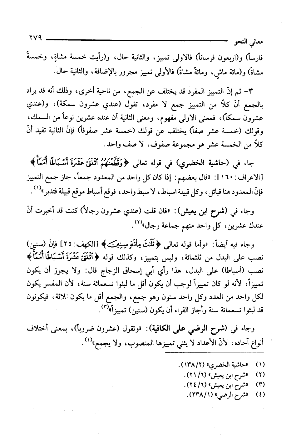 3 - ثم إن التمييز المفرد قد يختلف عن الجمع، من ناحية أخرى، وذلك أنه قد يراد بالجمع أن كلا من التمييز جمع لا مفرد، تقول: (عندي عشرون سمكة)، و (عندي عشرون سمكا) فمعنى الأولى مفهوم، ومعنى الثانية أن عنده عشرين نوعا من السمك، وقولك (خمسة عشر صفا) يختلف عن قولك (خمسة عشر صفوفا) فإن الثانية تفيد أن كلا من الخمسة عشر هو مجموعة صوف، لا صف واحد.