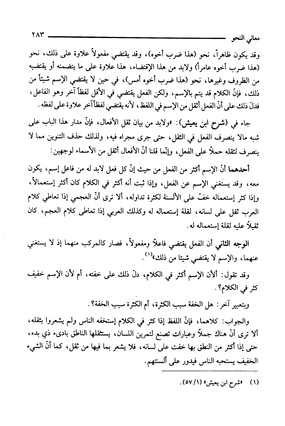 جاء في (شرح ابن يعيش): " ولابد من بيان ثقل الأفعال، فإن مدار هذا الباب على شبه مالا ينصرف الفعل في الثقل، حتى جرى مجراه فيه، ولذلك حذف التنوين مما لا ينصرف لثقله حملا على الفعل، وإنما قلنا أن الأفعال أثقل من الأسماء لوجهين: