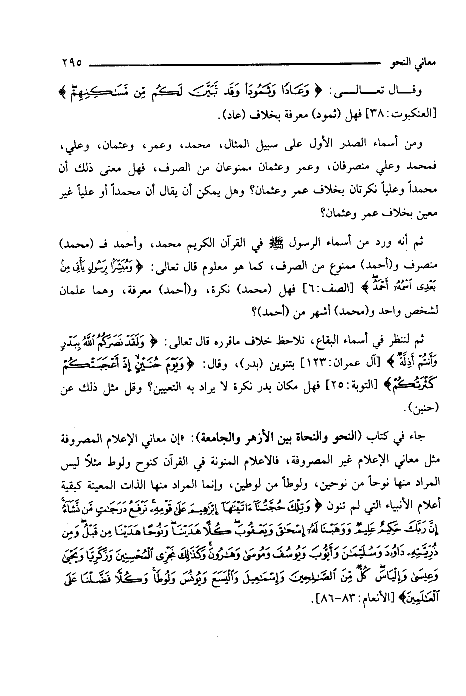 جاء في كتاب (النحو والنحاة بين الأزهر والجامعة): إن معاني الإعلام المصروفة مثل معاني الإعلام غير المصروفة فالإعلام المنونة في القرآن كنوح ولوط مثلا ليس المراد منها نوحا من نوحين، ولوطا من لوطين، وإنما المراد منها الذات المعينة كبقية أعلام الأنبياء التي لم تنون {وتلك حجتنا آتيناها إبراهيم على قومه نرفع درجات من نشاء إن ربك حكيم عليم ووهبنا له إسحاق ويعقوب وكلا هدينا ونوحا هدينا من قبل ومن ذريته داود وسليمان وأيوب ويوسف وموسى وهارون وكذلك نجزي المحسنين وزكريا ويحيى وعيسى وإلياس كل من الصالحين وإسماعيل واليسع ويونس ولوطا وكلا فضلنا على العالمين} [الأنعام: 83 - 86].