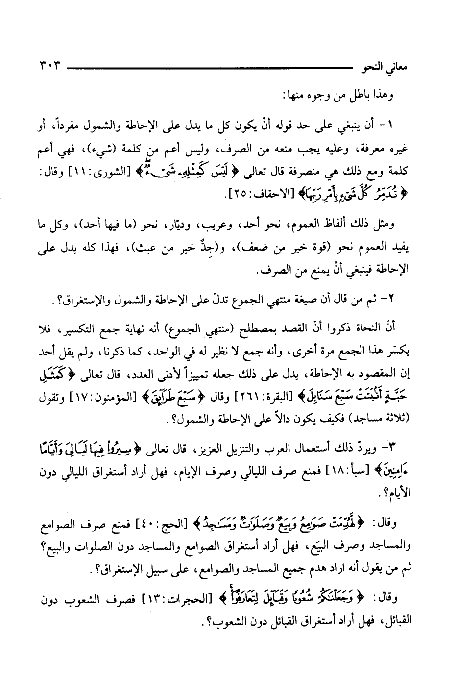 1 - أن ينبغي على حد قوله أن يكون كل ما يدل على الإحاطة والشمول مفردًا، أو غيره معرفة، وعليه يجب منعه من الصرف، وليس أعم من كلمة (شيء) فهي أعم كلمة ومع ذلك هي منصرفة قال تعالى: {ليس كمثله شيء} [الشوري: 11]، وقال: {ندمر كل شيء بأمر ربها} [الأحقاف: 25].
