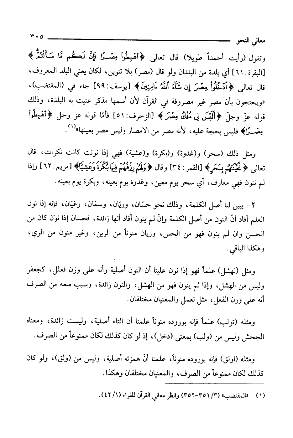 وتقول (رأيت أحمدًا طويلا) قال تعالى: {اهبطوا مصرًا فإن لكم ما سألتم} [البقرة: 61]، أي بلدة من البلدان ولو قال (مصر) بلا تنوين، لكان يعني البلد المعروف، قال تعالى: {ادخلوا مصر إن شاء الله آمنين} [يوسف: 99]، جاء في (المقتضب): " ويحتجون بأن مصر غير مصروفة في القرآن لأن اسمها مذكر عنيت به البلدة، وذلك قوله عز وجل {أليس لي ملك مصر} [الزخرف: 51]، فأما قوله عز وجل {اهبطوا مصرا} فليس بحجة عليه، لأنه مصر من الأمصار وليس مصر بعينها (¬1).
