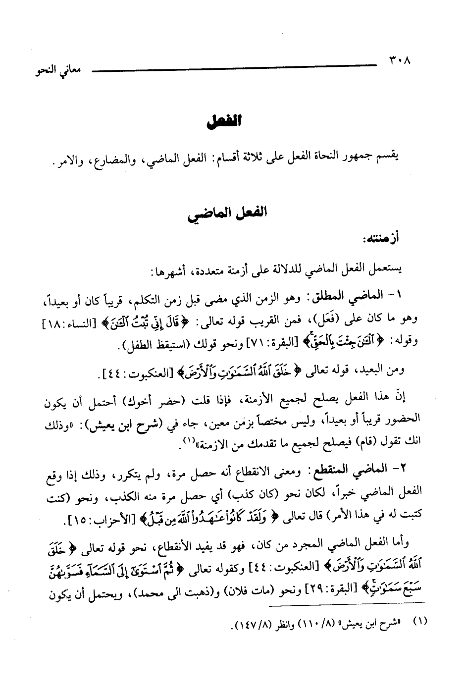1 - الماضي المطلق: وهو الزمن الذي مضى قبل زمن التكلم، قريبا كان أو بعيدا وهو ما كان على فعل، فمن القريب قوله تعالى: {قال إني تبت الآن} [النساء: 18]، وقوله: {الآن جئت بالحق} [البقرة: 71]، ونحو قولك (استيقظ الطفل).