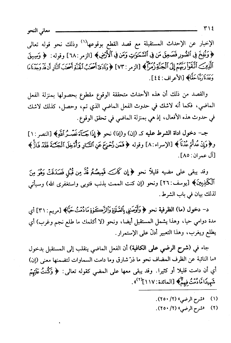 د - دخول ما الظرفية، نحو: {وأوصاني بالصلاة والزكاة ما دمت حيا} [مريم: 31] أي مدة دوامي حيا، وهذا يشمل المستقبل أيضا، ونحو (لا أكلمك ما طلع نجم وغرب) أي يطلع ويغرب، وهذا التعبير أدل على الاستمرار.