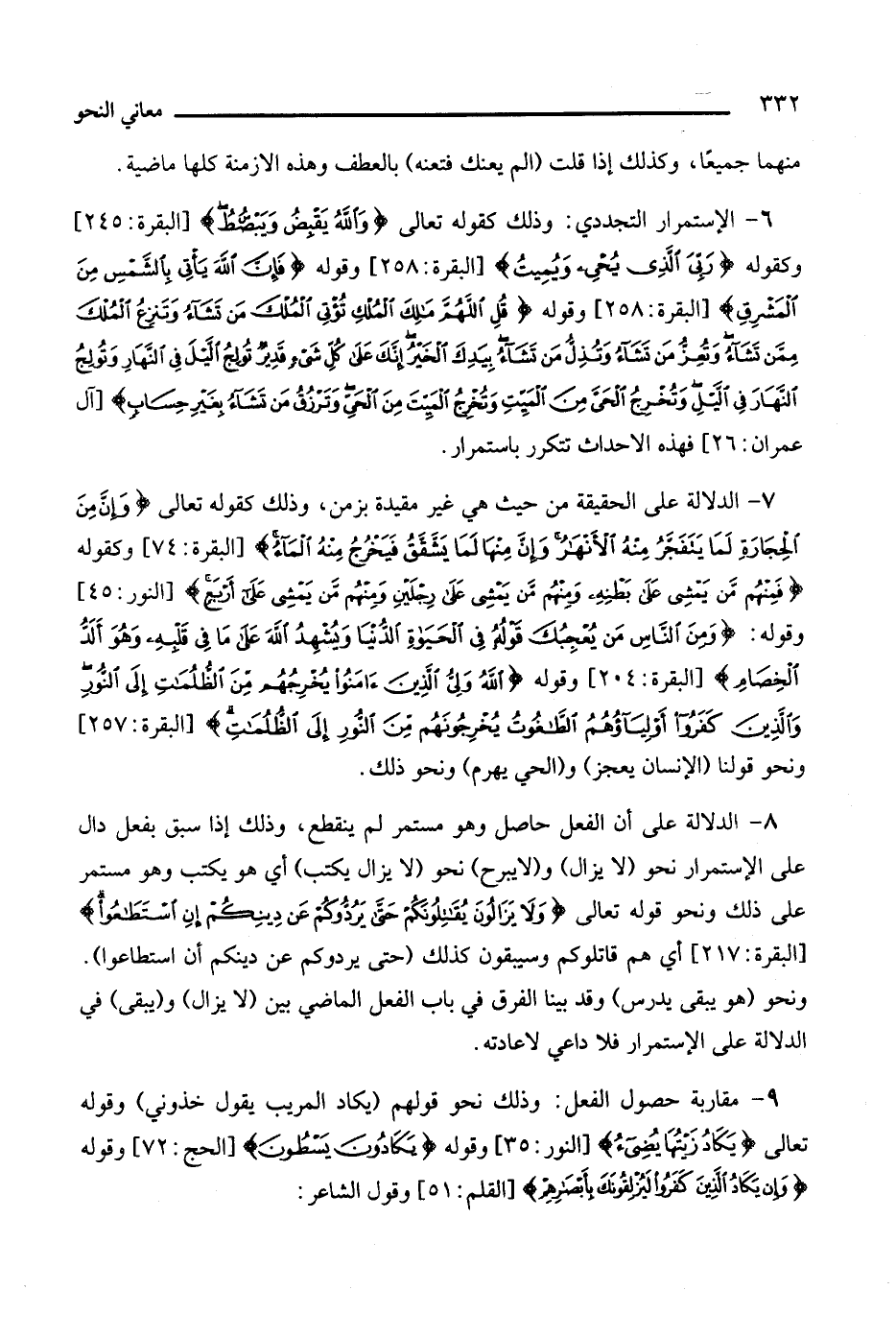 6 - الاستمرار التجددي: وذلك كقوله تعالى: {والله يقبض ويبصط} [البقرة: 245]، وكقوله: {ربي الذي يحي ويميت} [البقرة: 258]، وقوله: {فإن الله يأتي بالشمس من المشرق} [البقرة: 258]، وقوله: {قل اللهم مالك الملك تؤتى الملك من تشاء وتنزع اللك ممن تشاء وتعز من تشاء وتذل من تشاء بيدك الخير إنك على كل شيء قدير تولج الليل في النهار وتولج النهار في الليل وتخرج الحي من الميت وتخرج الميت من الحي وترزق من تشاء بغير حساب} [ال عمران: 26]، فهذه الأحداث تتكرر باستمرار.