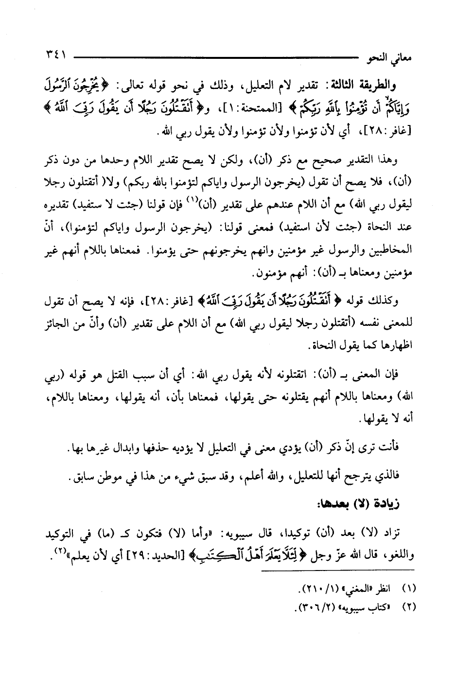 وهذا التقدير صحيح مع ذكر (أن)، ولكن لا يصح تقدير اللام وحدها من دون ذكر أن، فلا يصح أن تقول (يخرجون الرسول وإياكم لتؤمنوا بالله ربكم) ولا (أتقتلون رجلا ليقول ربي الله) مع أن اللام عندهم على تقدير (أن) (¬1). فإن قولنا (جئت لاستفيد) تقديره عند النحاة (جئت لأن أستفيد) فمعنى قولنا: (يخرجون الرسول وإياكم لتؤمنوا أن المخاطبين والرسول غير مؤمنين وأنهم يخرجون حتى يؤمنوا فمعناها باللام أنهم غير مؤمنين ومعناها بـ (أن): أنهم مؤمنون.