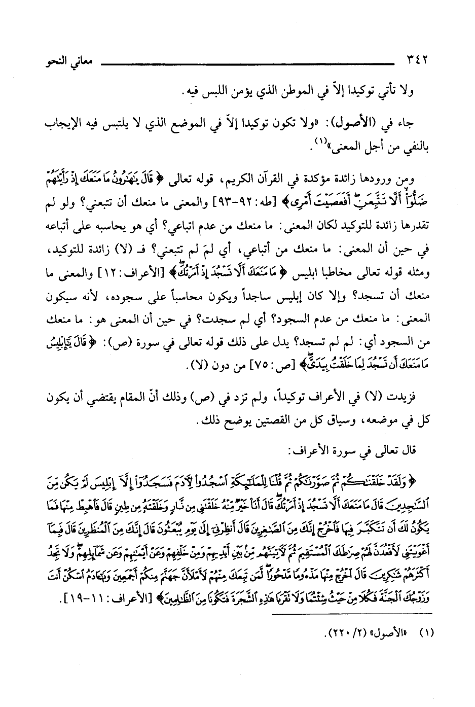 ومن ورودها زائدة مؤكدة في القرآن الكريم: قوله تعالى: {قال يا هارون ما منعك إذ رأيتهم ضلوا ألا تتبعن أفعصيت أمري} [طه: 92 - 93]، والمعنى ما منعك أن تتبعني؟ لو لم تقدرها زائدة للتوكيد، لكان المعنى: ما منعك من عدم اتباعي؟ أي هو يحاسبه على اتباعه في حين أن المعنى: ما منعك من اتباعي، أي لم لم تتبعني؟ فـ (لا) زائدة للتوكيد، ومثله قوله تعالى: مخاطبا إبليس: {ما منعك ألا تسجد إذ أمرتك} [الأعراف: 12]، والمعنى ما منعك أن تسجد؟ وإلا كان إبليس ساجدًا ويكون محاسبا على سجودهـ، لأنه سيكون المعنى: ما منعك من عدم السجود؟ أي لم سجدت، ؟ في حين أن المعنى هو: ما منعك من السجود أي: لم لم تسجد؟ يدل على ذلك قوله تعالى في سورة (ص): {قال يإبليس ما منعك أن تسجد لماخلقت بيدي} [ص: 75]، من دون (لا).