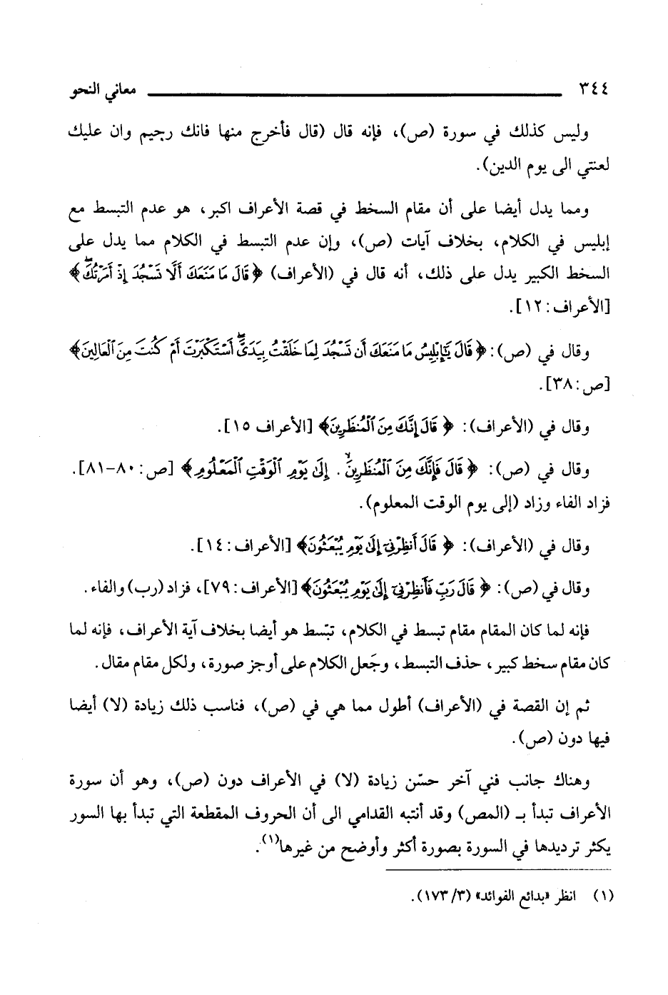 ومما يدل أيضا على ان مقام السخط في قصة الأعراف أكبر، وهو عدم التبسط مع إبليس في الكلام، بخلاف آيات ص، وإن عدم التبسط في الكلام مما يدل على السخط الكبير يدل على ذلك، أنه قال في الأعراف قال ما منعك ألا تسجد إذ أمرتك [الأعراف: 12].