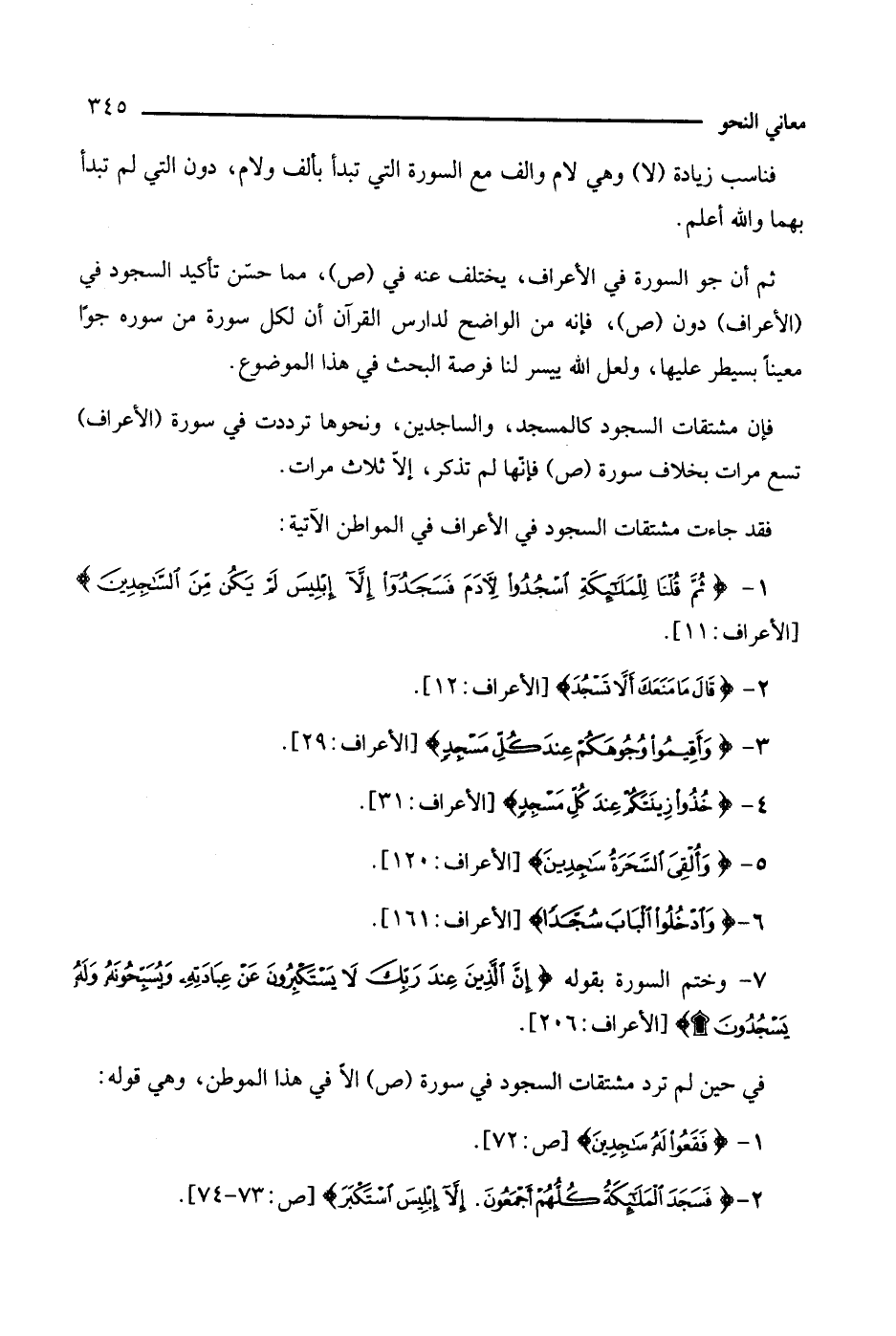 ثم أن جو السورة في الأعراف، يختلف عنه في ص، مما حسن تأكيد السجود في الأعراف دون ص، فإنه من الواضح لدارس القرآن أن لكل سورة من سوره جوا معينا يسيطر عليها، ولعل الله ييسر لها فرصة البحث في هذا الموضوع.