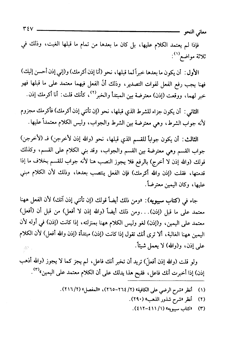 جاء في (كتاب سيبويه): " ومن ذلك أيضا قولك (إن تأتني إذن آتك) لأن الفعل ههنا معتمد على ما قبل (إذن) .. ومن ذلك أيضا (والله إذن لا أفعل) من قبل أن (أفعل) معتمد عى اليمين، و (إذن) لغو وليس الكلام ههنا بمنزلته، إذا كانت (إذن) في أوله لأن اليمين ههنا الغالبة، ألا ترى أنك تقول إذا كانت إذن مبتدأة (إذن والله أفعل) لأن الكلام على إذن، و (والله) لا يعمل شيئا.