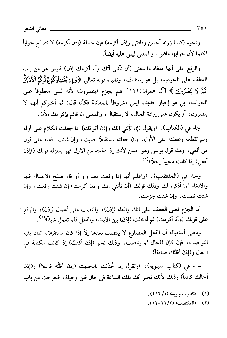 والرفع على أنها ملغاة والمعنى (أن تأتني آتك وأنا أكرمك إذن) فليس هو من باب العطف على الجواب، بل هو استئناف، ونظيره قوله تعالى: {وإن يقاتلوكم يولوكم الأدبار ثم لا ينصرون} [آل عمران: 111]، فلم يجزم (ينصرون) لأنه ليس معطوفا على الجواب، بل هو إخبار جديد، ليس مشروطا بالمقاتلة فكأنه قال: ثم أخبركم أنهم لا ينصرون أو يكون على إرادة الحال، لا إستقبال، والمعنى أنا قائم بإكرامك الآن.
