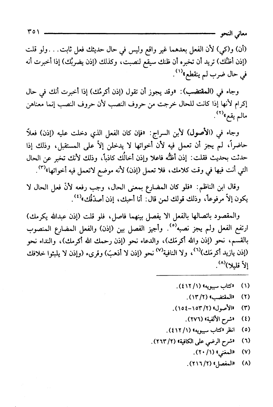 وجاء في (المقتضب): " وقد يجوز أن تقول (إذن أكرمك) إذا أخبرت أنك في حال إكرام لأنها إذا كانت للحال خرجت من حروف النصب لأن حروف النصب إنما معناهن مالم يقع (¬2).
