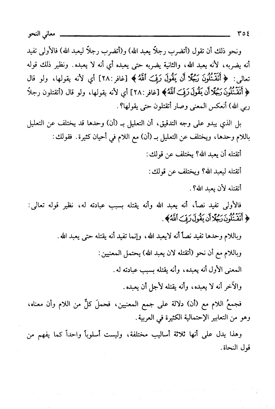 ونحو ذلك أن تقول (أتضرب رجلا يعبد الله) و (أتضرب رجلا ليعبد الله) فالأولى تفيد أنه يضربه، لأنه يعبد الله والثاني يضربه حتى يعبده أي أنه لا يعبده، ونظير ذلك قوله تعالى: {أتقتلون رجلا أن يقول ربي الله} [غافر: 28]، أي لأنه يقولها، ولو قال {أتقتلون رجلا أن يقول ربي الله} [غافر: 28]، أي لأنه يقولها، ولو قال (أتقتلون رجلا ربي الله) أنعكس المعنى وصار أتقتلون حتى يقولها؟