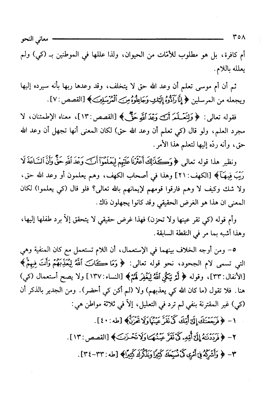 فقوله تعالى: {ولتعلم أن وعد الله حق} [القصص: 13]، معناه الاطمئنان، لا مجرد العلم، ولو قال (كي تعلم أن وعد الله حق) لكان المعنى أنها تجهل أن وعد الله حق وأنه رده إليها لتعلم هذا الأمر.