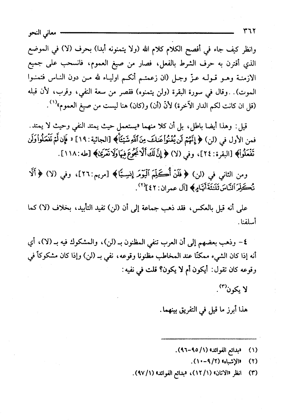 قيل: وهذا ايضا باطل، بل أن كلا منهما يستعمل حيث يمتد النفي وحيث لا يمتد فمن الأول في لن: {إنهم لن يغنوا عنك من الله شيئا} [الجاثية: 19]: {فإن لم تفعلوا ولن تفعلوا} [البقرة: 24]. و (لا) {إن لك ألا تجوع فيها ولا تعرى} [طه: 118].