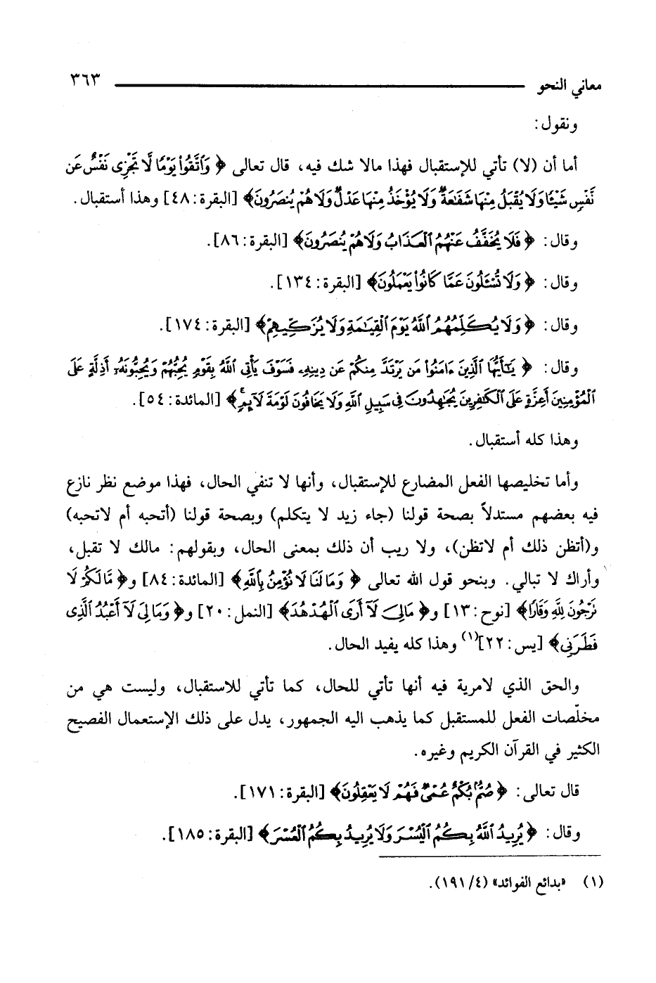 وأما تخليصها الفعل المضارع للاستقبال، وأنها لا تنفي الحال، فهذا موضع نظر نازع فيه بعضهم مستدلا بصحة قولنا (جاء زيد لا يتكلم) وبصحة قولنا (أتحبه أم لا تحبه) و (أتظن ذلك أم لا تظن) ولا ريب أن ذلك بمعنى الحال، وبقولهم: مالك لا تقبل، وأراك لا تبالي، وبنحو قول الله تعالى {ومالنا لا نؤمن بالله} [المائدة: 84]، و {مالكم لاترجون لله وقارا} [نوح: 13]، و {مالي لا أرى الهدهد} [النمل: 20]، و {مالي لا أعبد الذي فطرني} [يس: 22] (¬1). وهذا كله يفيد الحال.