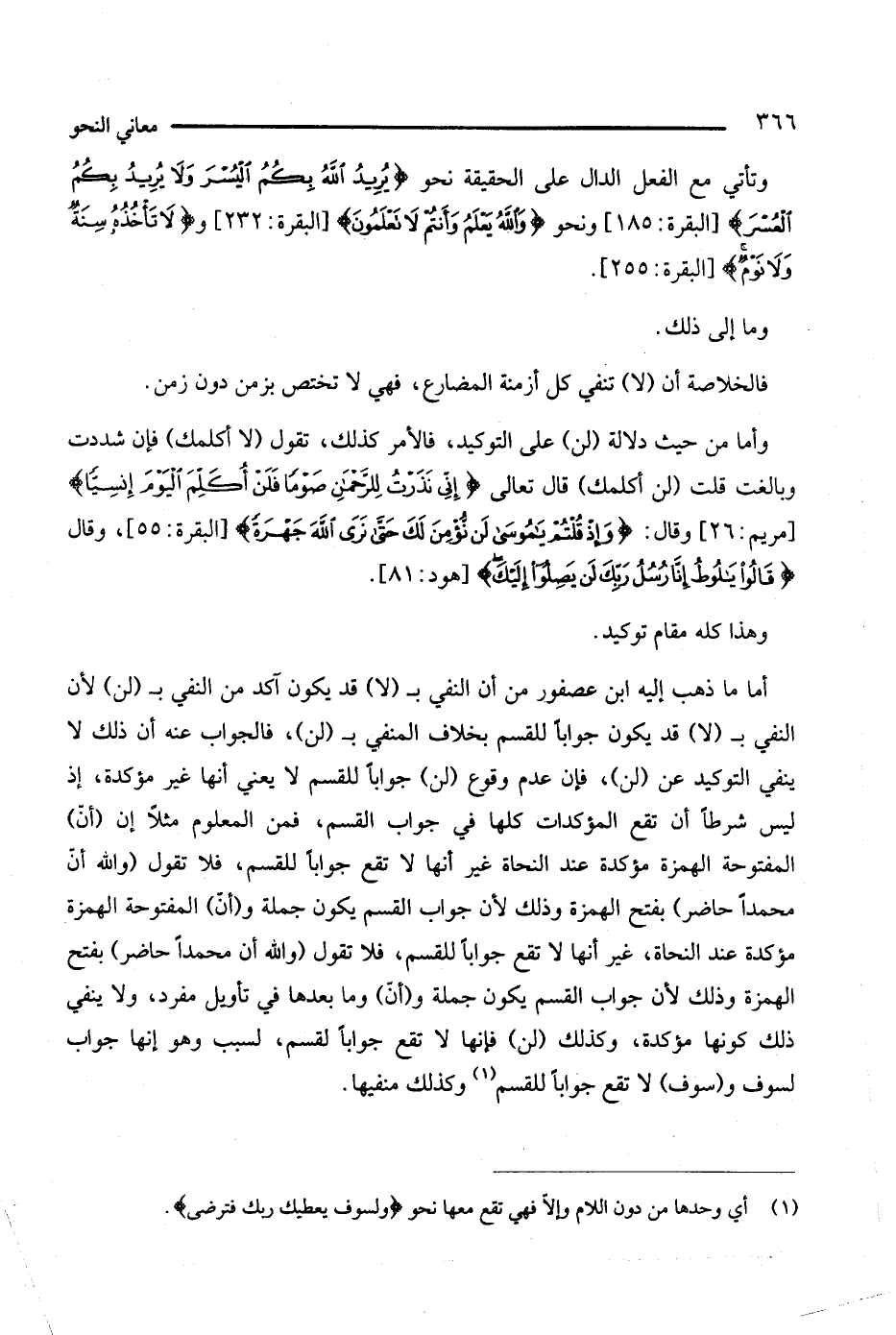 وأما من حيث دلالة (لن) على التوكيد، فالأمر كذلك، تقول (لا أكلمك) فإن شددت وبالغت قلت (لن أكلمك) قال تعالى: {إني نذرت للرحمن صوما فلن أكلم اليوم إنسيا} [مريم: 26]، وقال: {وإذ قلتم يا موسى لن نؤمن لك حتى نرى الله جهرة} [البقرة: 55]، وقال: {قالوا يا لوط إنا رسل ربك لن يصلوا إليك} [هود: 81].