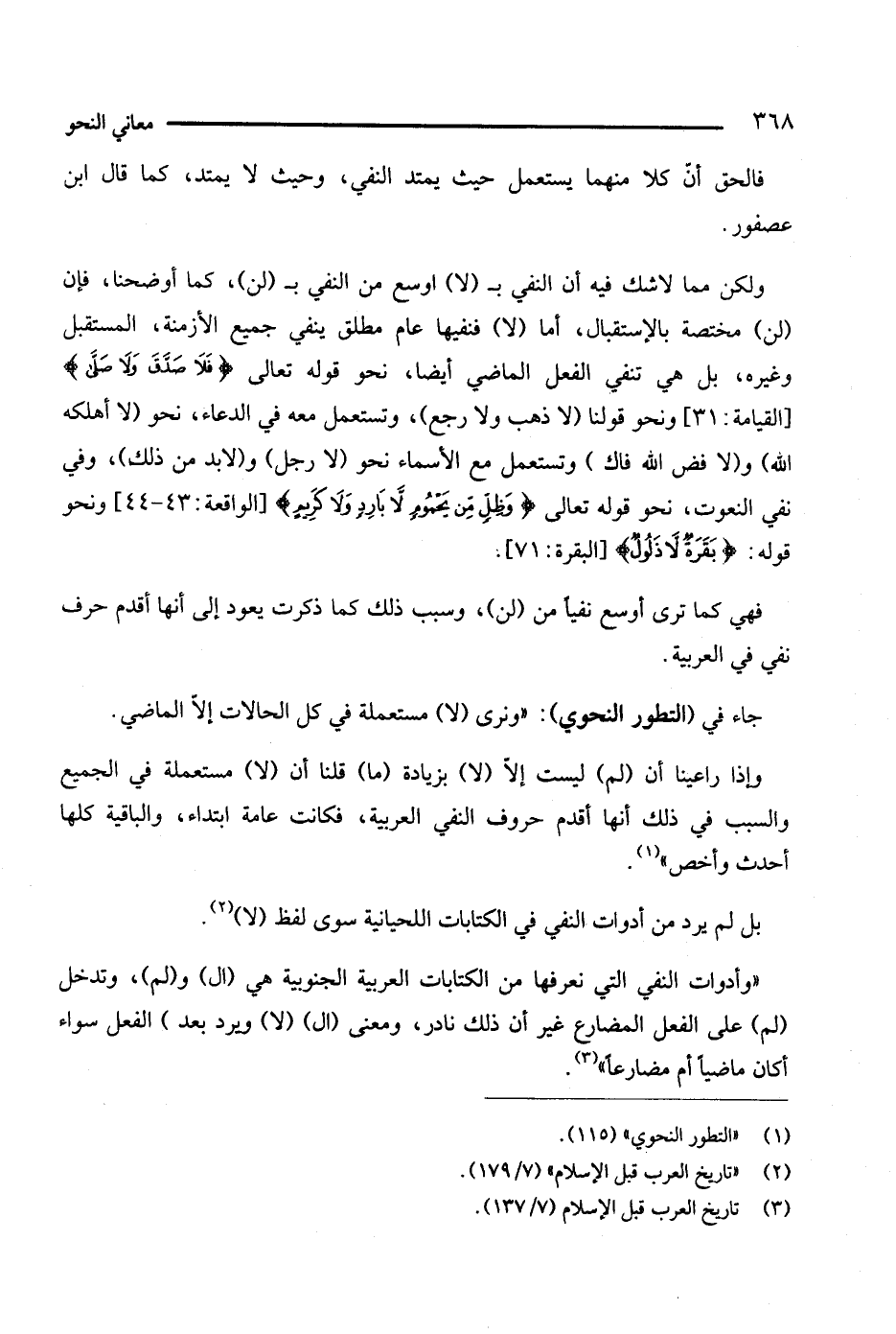 فهي كما ترى أوسع نفيا من (لن)، وسبب ذلك كما ذكرت يعود إلى أنها أقدم حرف نفي في العربية. جاء في (التطور النحوي): " ونرى (لا) مستعملة في كل الحالات إلا الماضي. وإذا راعينا أن (لم) ليست إلا (لا) بزيادة (ما) قلنا أن (لا) مستعملة في الجميع والسبب في ذلك أنها أقدم حروف النفي العربية، فكانت عامة ابتداء، والباقية كلها أحدث وأخص (¬1).