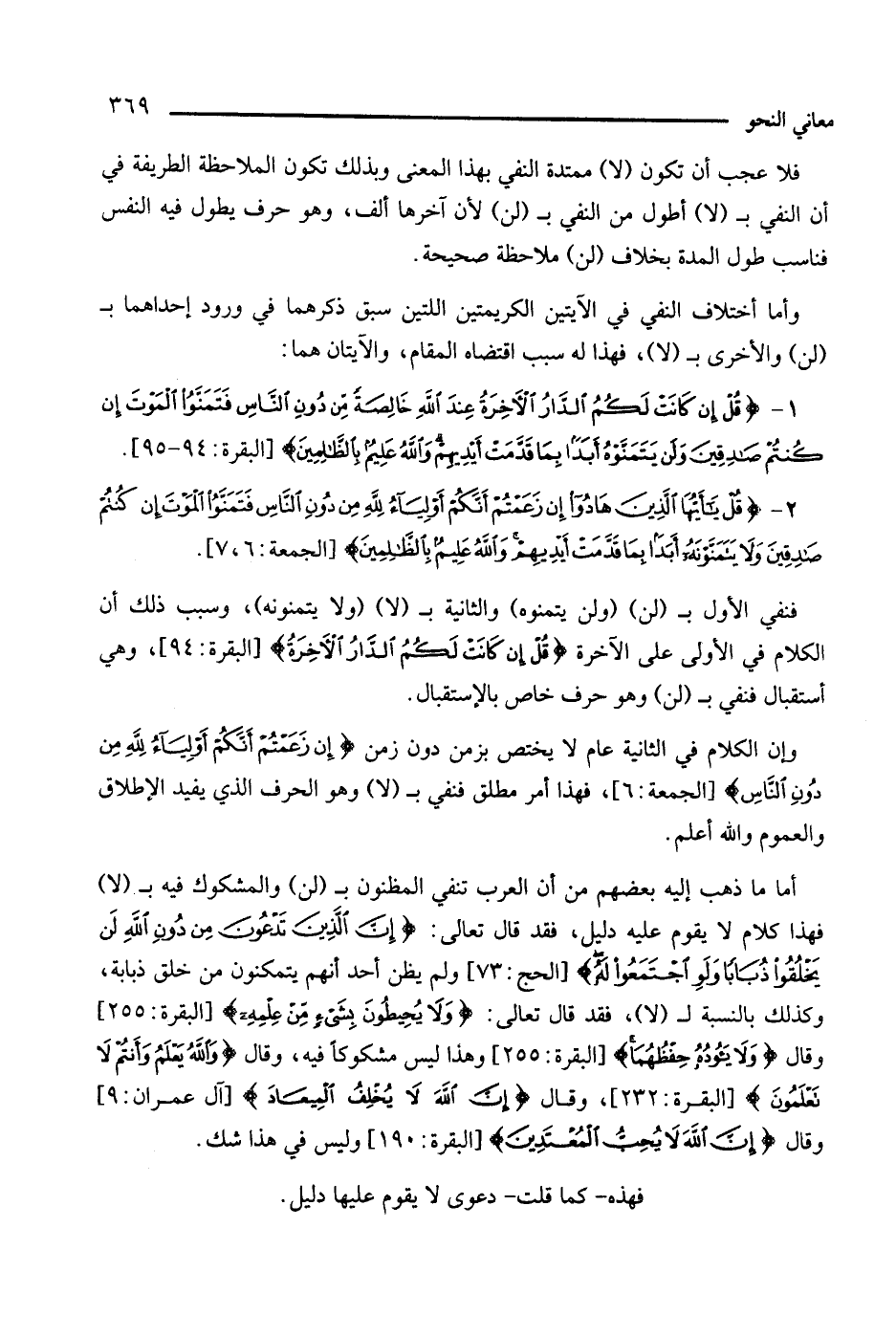 أما ما ذهب إليه بعضهم من أن العرب تنفي المظنون بـ (لن) والمشكوك فيه بـ (لا) فهذا كلام لا يقوم عليه دليل، فقد قال تعالى: {إن الذين تدعون من دون الله لن يخلقوا ذبابا ولو اجتمعوا له} [الحج: 73]، ولم يظن أحد أنهم يتمكنون من خلق ذبابة، وكذلك بالنسبة لـ (لا)، فقد قال تعالى: {ولا يحيطون بشيء من علمه} [البقرة: 255]، وقال: {ولا يؤده حفظهما} [البقرة: 255]، وهذا ليس مشكوكا فيه، وقال {والله يعلم وأنتم لا تعلمون} [البقرة: 232]، وقال: {إن الله لا يخلف الميعاد} [آل عمران: 9]، وقال: {إن الله لا يحب المعتدين} [البقرة: 190]، وليس في هذا شك.