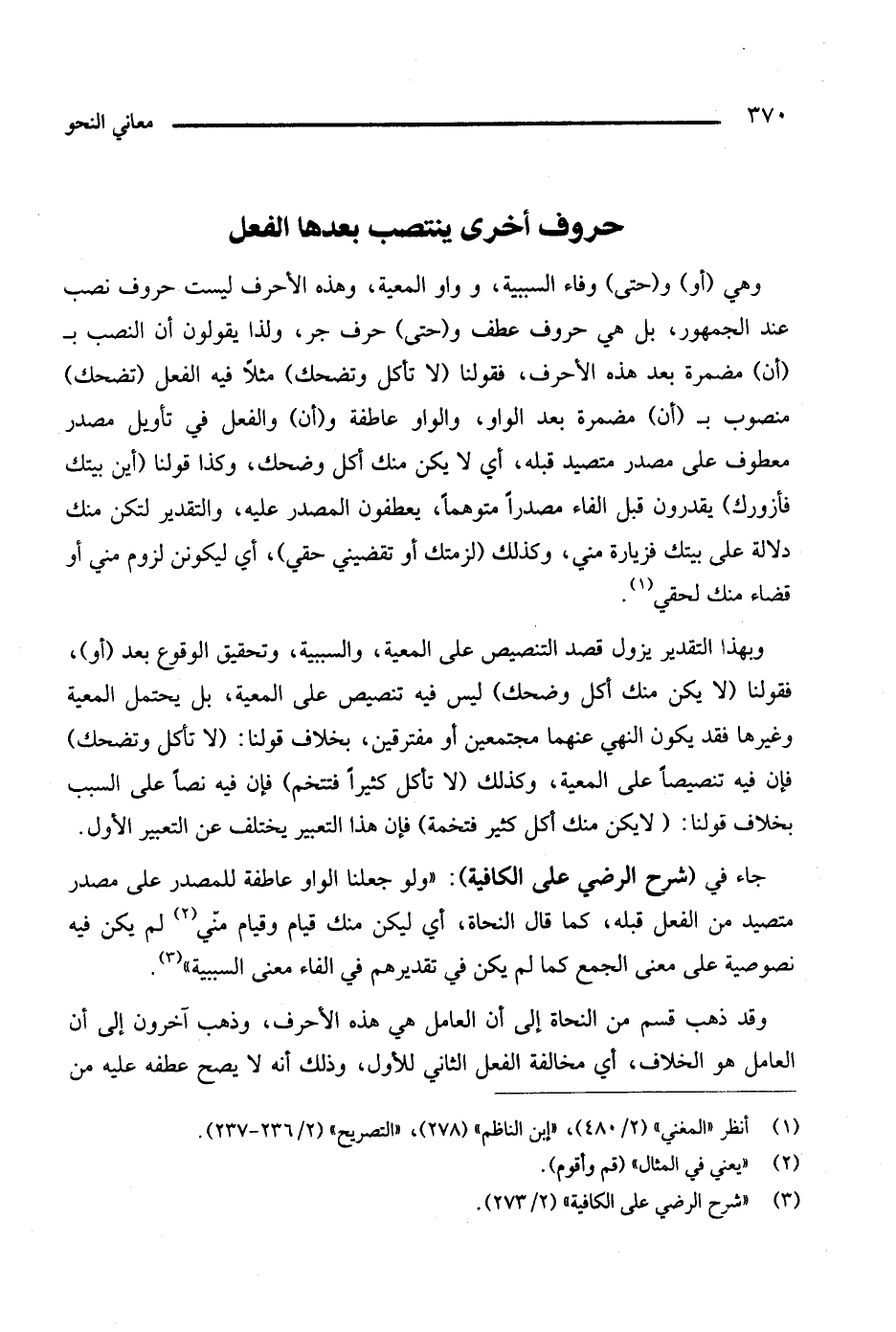 وبهذا التقدير يزول قصد التنصيص على المعية والسببية وتحقيق الوقوع بعد (أو)، فقولنا (لا يكن منك أكل وضحك) ليس فيه تنصيص على المعية، بل يحتمل المعية وغيرها فقد يكون النهي عنهما مجتمعين أو مفترقين، بخلاف قولنا: (لا تأكل وتضحك) فإن فيه تنصيصا على المعية، وكذلك (لا تأكل كثيرا فتتخم) فإن فيه نصًا على السبب بخلاف قولنا: (لا يكن منك أكل كثيرا فتخمة) فإن هذا التعبير يختلف عن التعبير الأول. جاء في (شرح الرضي على الكافية): " ولو جعلنا الواو عاطفة للمصدر على مصدر متصيد من الفعل قبله، كما قال النحاة، أي ليكن منك قيام وقيام منى (¬2). لم يكن فيه نصوصية على معنى الجمع كما لم يكن في تقديرهم في الفاء معنى السببية (¬3).