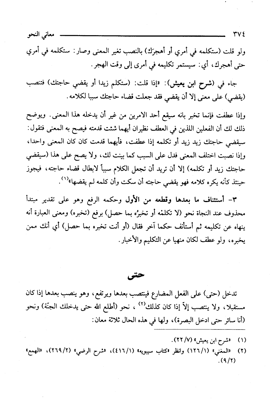 تدخل (حتى) على الفعل المضارع فينتصب بعدها ويرتفع، وهو ينصب بعدها إذا كان مستقبلا، ولا ينتصب إلا إذا كان كذلك (¬2).، نحو (أطلع الله حتى يدخلك الجنة) ونحو (أنا سائر حتى أدخل البصرة)، ولها في هذه الحالا ثلاثة معان: