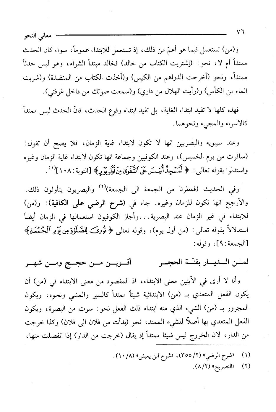 وعند سيبويه والبصريين أنها لا تكون لابتداء غاية الزمان، فلا يصح أن تقول: (سافرت من يوم الخميس) وعند الكوفيين وجماعة أنها تكون لابتداء غاية الزمان، وغيره واستدلوا بقوله تعالى: {لمسجد أسس على التقوى من أول يوم} [التوبة: 108] (¬1).