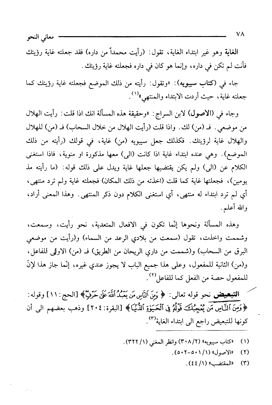 الغاية وهو غير ابتداء الغاية، تقول: (رأيت محمدًا من داره) فقد جعلته غاية رؤيتك فأنت لم تكن في داره وإنما هو كان في داره فجعلته غاية رؤيتك.