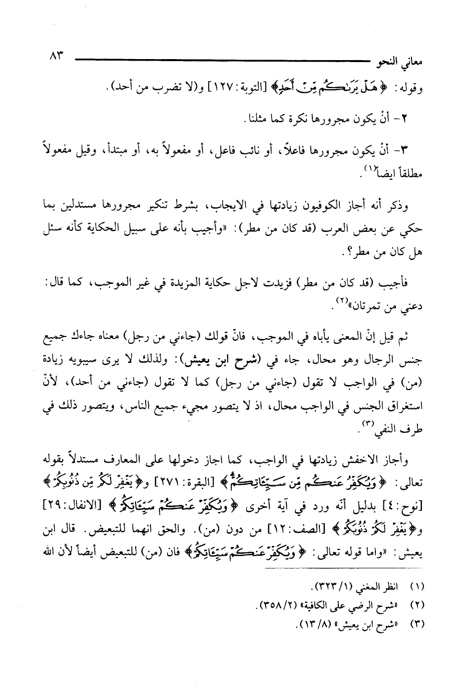 وأجاز الأخفش زيادتها في الواجب، كما أجاز دخولها على المعارف مستدلا بقوله تعالى: {ويكفر عنكم من سيئاتكم} [البقرة: 271]، و {يغفر لكم من ذنوبكم} [نوح: 4]، بدليل أنه ورد في آية آخرى، {ويكفر عنك سيئاتكم} [الأنفال: 29]، {ويغفر لكم ذنوبكم} [الصف: 12]، من دون (من) والحق أنهما للتبعيض، قال ابن يعيش: وأما قوله تعالى: {ويكفر عنكم سيئاتكم} فإن (من) للتبعيض أيضا لأن الله