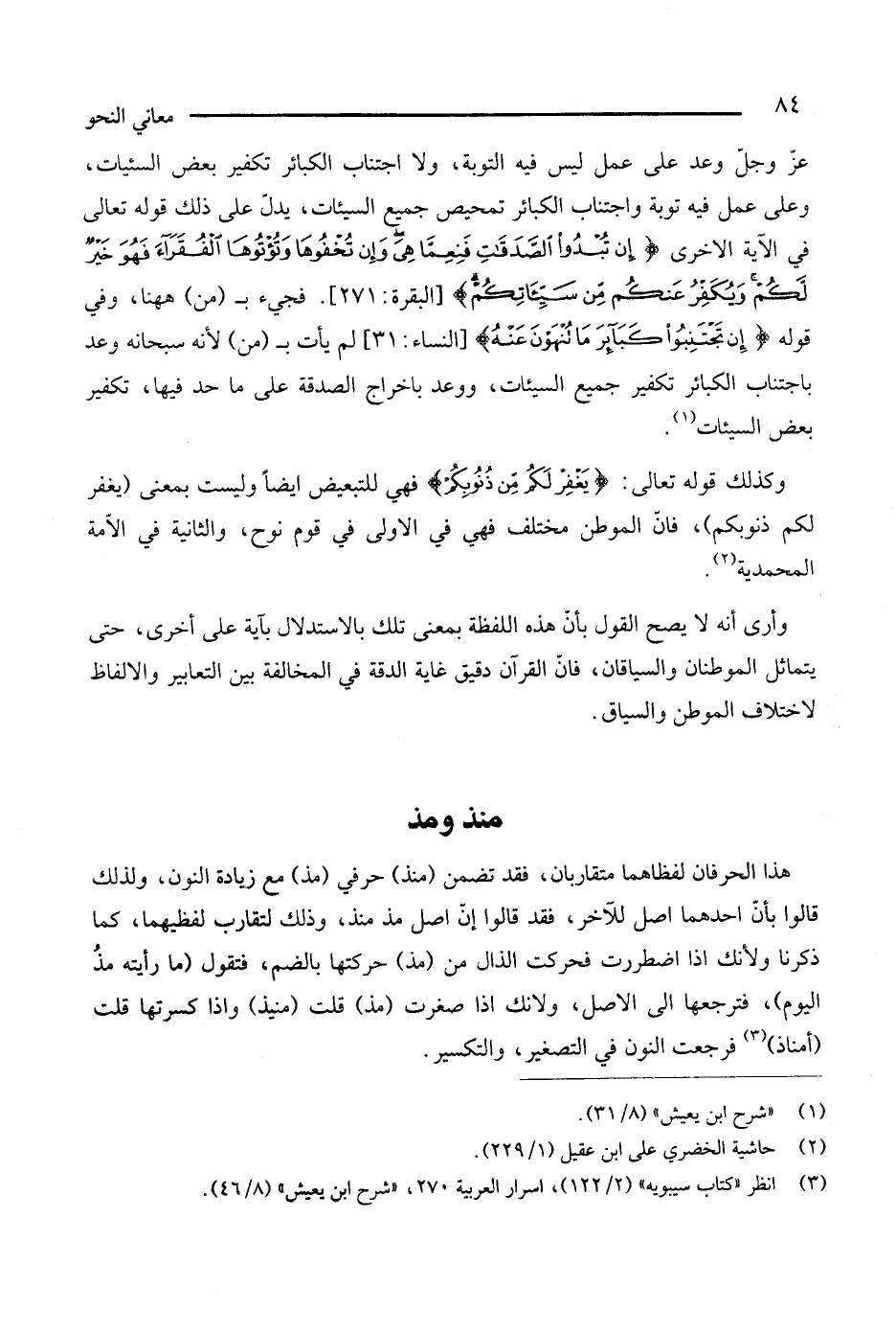 عز وجل وعد على عمل ليس فيه التوبة، ولا اجتناب الكبائر تكفير بعض السيئات، وعلى عمل فيه توبة واجتناب الكبائر تمحيص جميع السيئات، يدل على ذلك قوله تعالى في الآية الأخرى: {إن تبدوا الصدقات فنعما هي وإن تخوفها وتؤتوها الفقراء فهو خير لكم ويكفر عنكم من سيئاتكم} [البقرة: 271]، فجيء بـ (من) ههنا، وفي قوله: {إن تجتنبوا كبائر ما تنهون عنه} [النساء: 31]، لم يأت بـ (من) لأنه سبحانه وعد باجتناب الكبائر تكفير جميع السيئات، ووعد بإخراج الصدقة على ما حد فيها، تكفير بعض السيئات (¬1).