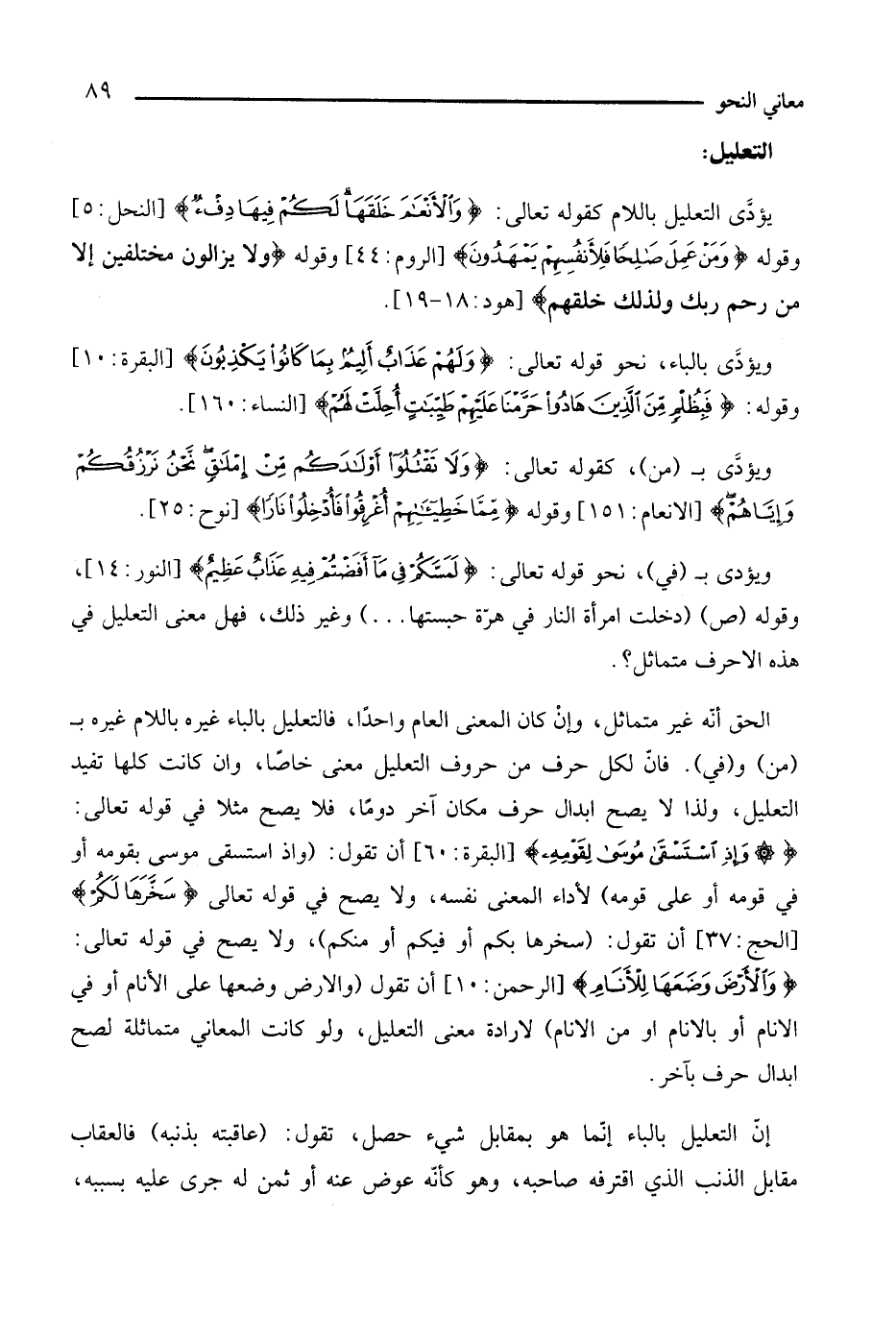 الحق أنه غير متماثل، وإن كان المعنى العام واحدا، فالتعليل بالباء غيره باللام غيره بـ (من) و (في) فإن لكل حرف من حروف التعليل معنى خاصا، وإن كانت كلها تفيد التعليل، ولذا لا يصح إبدال حرف مكان آخر دوما، فلا يصح مثلا في قوله تعالى: {وإذ استسقي موسى لقومه} [البقرة: 60]، أن تقول: (وإذ استسقي موسى بقومه أو في قومه أو على قومه) لأداء المعنى نفسه، ولا يصح في قوله تعالى: {سخرها لكم} [الحج: 37]، أن تقول: (سخرها بكم أو فيكم أو منكم)، ولا يصح في قوله تعالى: {والأرض وضعها للأنام} [الرحمن: 10]، أن تقول: (والأرض وضعها على الأنام أو في الأنام أو بالأنام أو من الأنعام) لإرادة معنى التعليل، ولو كانت المعاني متماثلة لصح إبدال حرف بآخر.