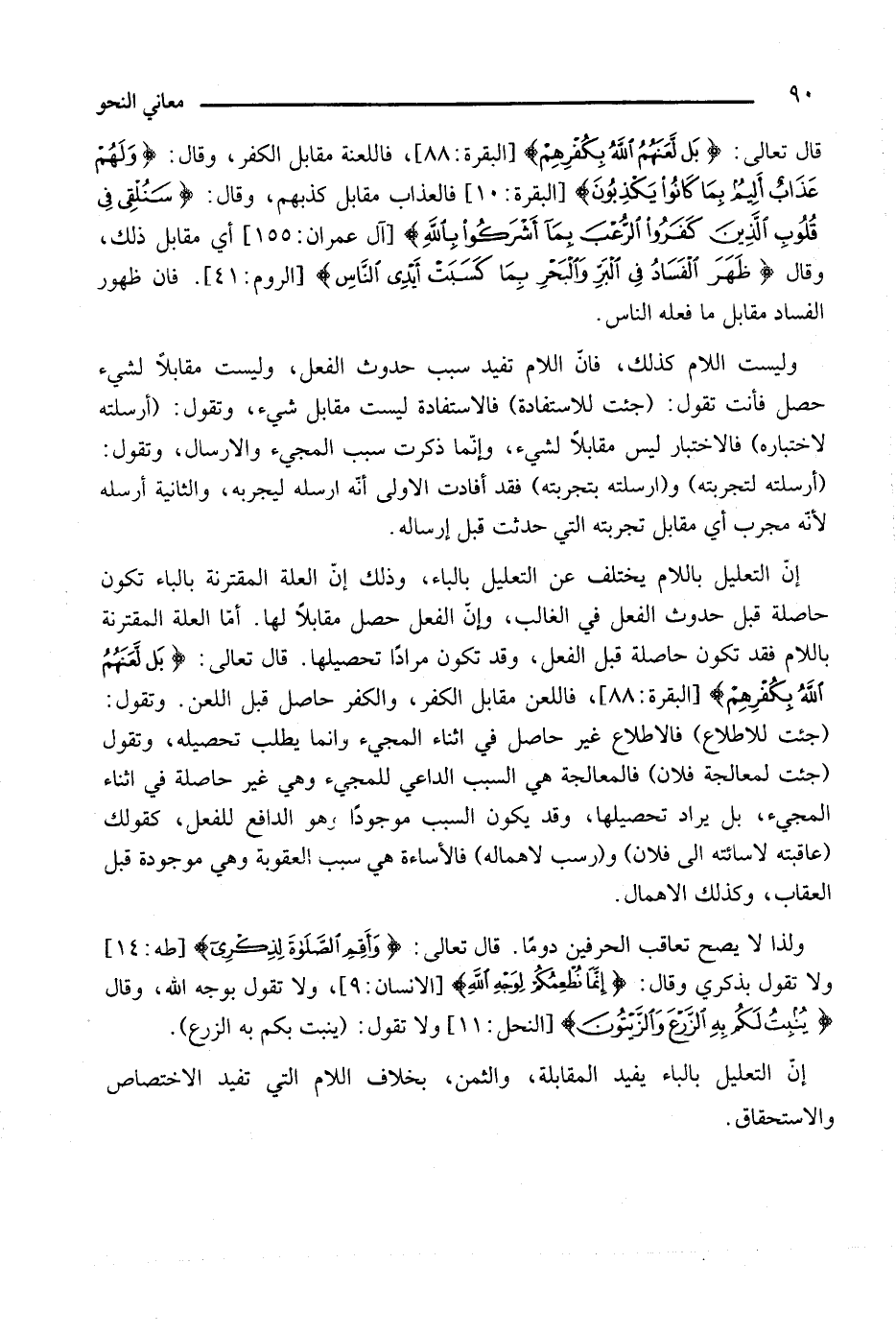 قال تعالى: {بل لعنهم الله بكفرهم} [البقرة: 88]، فاللعنة مقابل الكفر، وقال: {ولهم عذاب أليم بما كانوا يكذبون} [البقرة: 10] فالعذاب مقابل كذبهم، وقال: {سنلقى في قلوب الذين كفروا الرعب بما أشركوا بالله} [آل عمران: 155]، أي مقابل ذلك، وقال: {ظهر الفساد في البر والبحر بما كسبت أيدي الناس} [يوم: 41]، فإن ظهور الفساد مقابل ما فعله الناس.