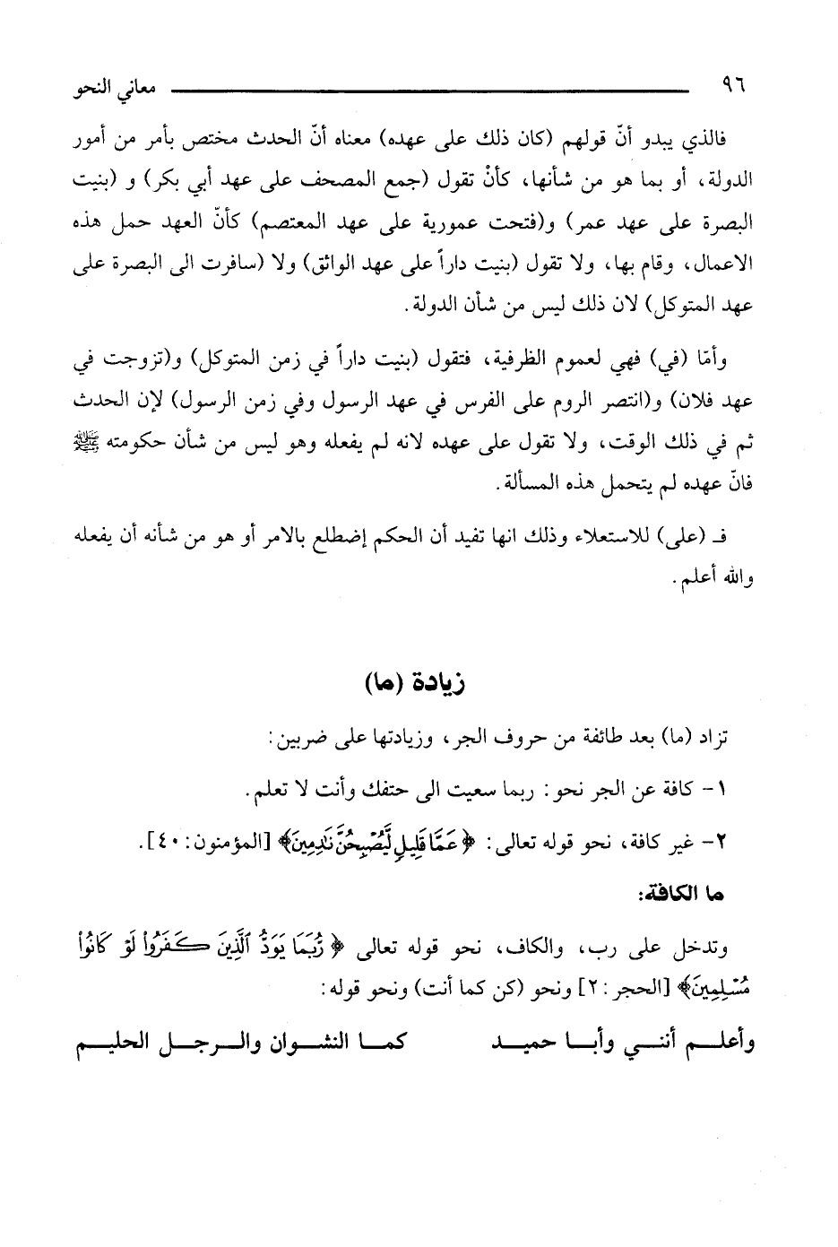 وأما (في) فهي لعموم الظرفية، فتقول: (بنيت دارا في زمن المتوكل) و (تزوجت في عهد فلان) و (انتصر الروم على الفرس في عهد الرسول وفي زمن الرسول) لأن الحدث ثم في ذلك الوقت، ولا تقول على عهده لأنه لم يفعله وهو ليس من شأن حكومته صلى الله عليه وسلم. فإن عهده لم يتحمل هذه المسألة.
