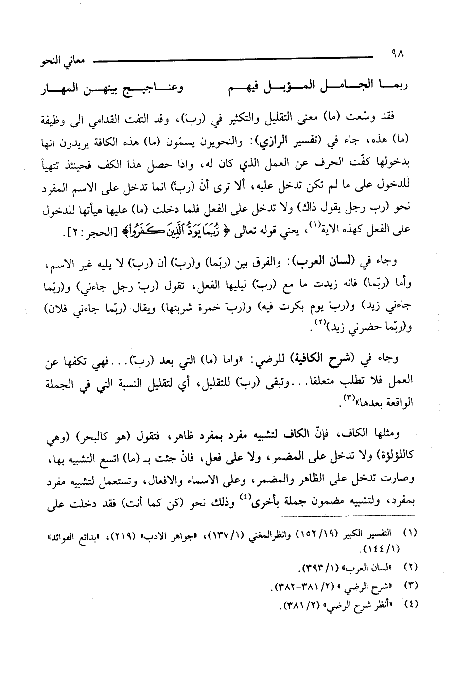 فقد وسعت (ما) معنى التقليل والتكثير في (رب)، وقد التفت القدامى إلى وظيفة (ما) هذه جاء في تفسير الرازي، والنحويون يسمون ما، هذه الكافة يريدون أنها بدخولها كفت الحرف عن العمل الذي كان له، وإذا حصل هذا الكف فحينئذ تتهيأ للدخول على ما لم تكن تدخل عليه، ألا ترى أن (رب) إنما تدخل على الاسم المفرد نحو (رب رجل يقول ذاك) ولا تدخل على الفعل فلما دخلت (ما) عليها هيأتها للدخول على الفعل كهذه الآية (¬1). يعني قوله تعالى: {ربما يود الذين كفروا} [الحجر: 2].