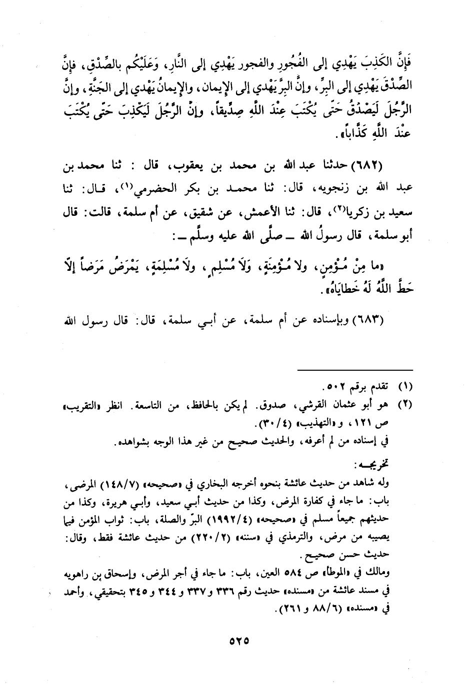حَدَّثَنَا عَبْدُ اللَّهِ بْنُ مُحَمَّدِ بْنِ يَعْقُوبَ، قال: ثنا مُحَمَّدُ بْنُ عَبْدِ اللَّهِ بْنِ زَنْجُوَيْهِ، قال: ثنا مُحَمَّدُ بْنُ بَكْرٍ الْحَضْرَمِيُّ، قال: ثنا سَعِيدُ بْنُ زَكَرِيَّا، قال: ثنا الأَعْمَشُ، عَنْ شَقِيقٍ، عَنْ أُمِّ سَلَمَةَ، قَالَتْ: قال أَبُو سَلَمَةَ: قَالَ رَسُولُ اللَّهِ صَلَّى اللهُ عَلَيْهِ وَسَلَّمَ: «§مَا مِنْ مُؤْمِنٍ وَلا مُؤْمِنَةٍ وَلا مُسْلِمٍ وَلا مُسْلِمَةٍ يَمْرَضُ مَرَضًا، إِلا حَطَّ اللَّهُ لَهُ خَطَايَاهُ»