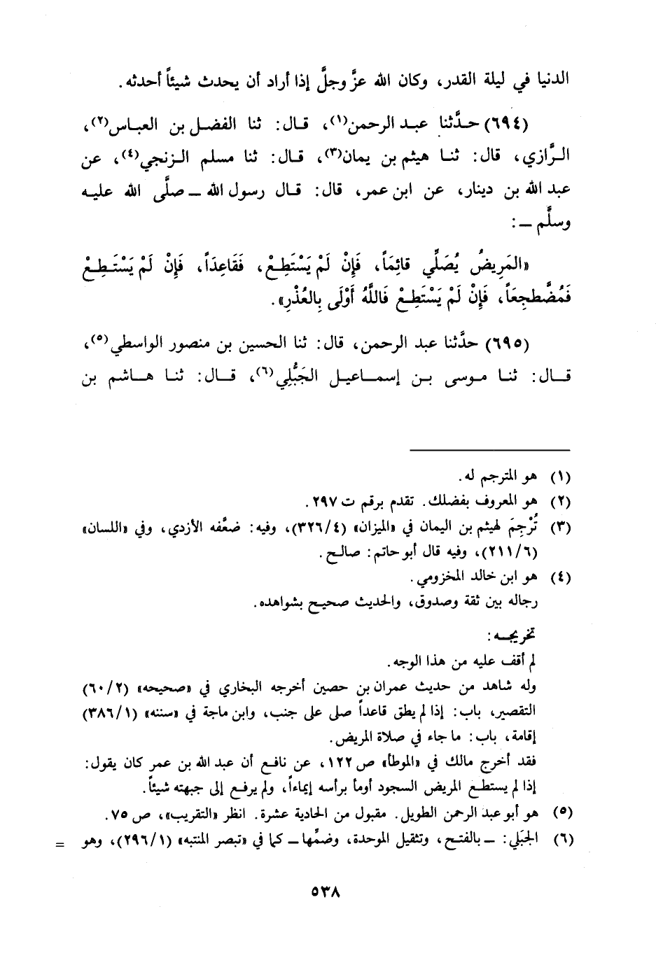 حَدَّثَنَا عَبْدُ الرَّحْمَنِ، قال: ثنا الْفَضْلُ بْنُ الْعَبَّاسِ الرَّازِيُّ، قال: ثنا هَيْثَمُ بْنُ يَمَانٍ، قال: ثنا مُسْلِمٌ الزَّنْجِي ُّ، عَنْ عَبْدِ اللَّهِ بْنِ دِينَارٍ، عَنِ ابْنِ عُمَرَ، قَالَ: قَالَ رَسُولُ اللَّهِ صَلَّى اللهُ عَلَيْهِ وَسَلَّمَ: «§الْمَرِيضُ يُصَلِّي قَائِمًا، فَإِنْ لَمْ يَسْتَطِعْ فَقَاعِدًا، فَإِنْ لَمْ يَسْتَطِعْ فَمُضْطَجِعًا، فَإِنْ لَمْ يَسْتَطِعْ فَاللَّهُ أَوْلَى بِالْعُذْرِ»