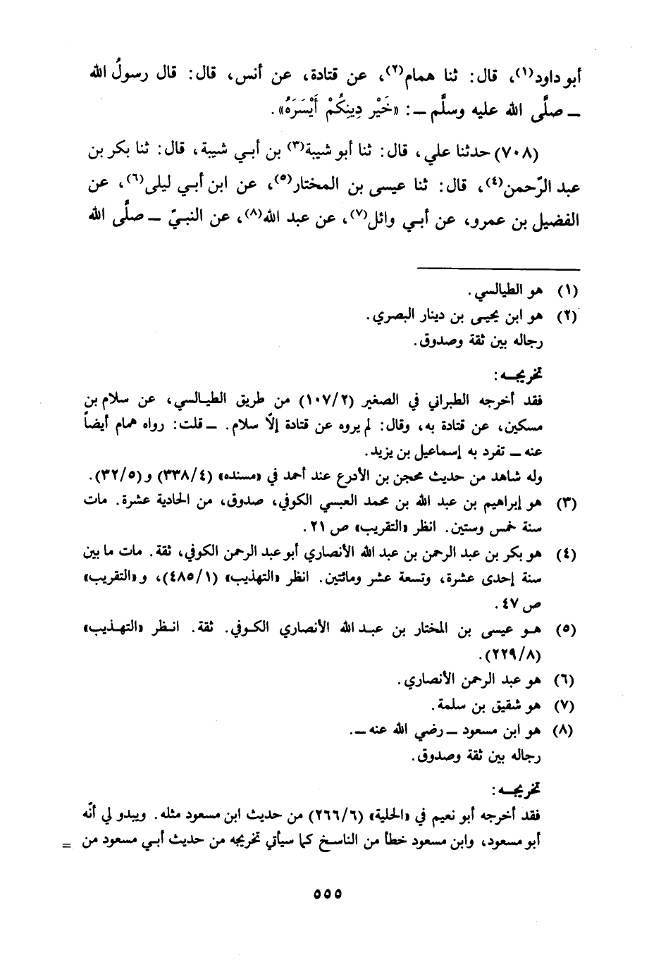 حَدَّثَنَا عَلِيٌّ، قال: ثنا أَبُو شَيْبَةَ بْنُ أَبِي شَيْبَةَ، قال: ثنا بَكْرُ بْنُ عَبْدِ الرَّحْمَنِ، قال: ثنا عِيسَى بْنُ الْمُخْتَارِ، عَنِ ابْنِ أَبِي لَيْلَى، عَنِ الْفُضَيْلِ بْنِ عَمْرٍو، عَنْ أَبِي وَائِلٍ، عَنْ عَبْدِ اللَّهِ، عَنِ النَّبِيِّ صَلَّى اللهُ عَلَيْهِ وَسَلَّمَ، قَالَ: «§الدَّالُّ عَلَى الْخَيْرِ كَفَاعِلِهِ»