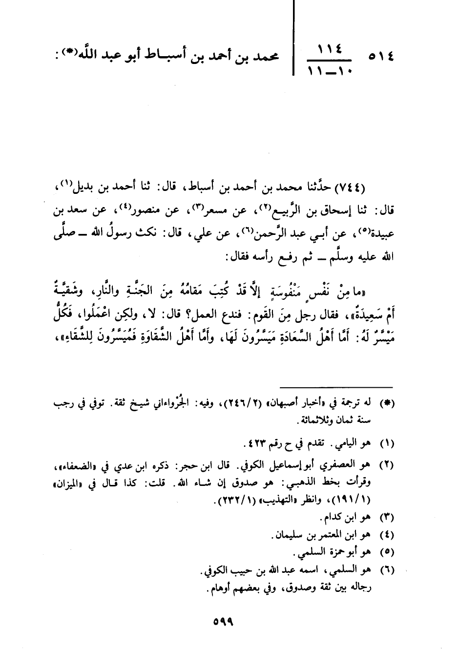 حَدَّثَنَا مُحَمَّدُ بْنُ أَحْمَدَ بْنِ أَسْبَاطِ، قال: ثنا أَحْمَدُ بْنُ بُدَيْلٍ، قال: ثنا إِسْحَاقُ بْنُ الرَّبِيعِ، عَنْ مِسْعَرٍ، عَنْ مَنْصُورٍ، عَنْ سَعْدِ بْنِ عُبَيْدَةَ، عَنْ أَبِي عَبْدِ الرَّحْمَنِ، عَنْ عَلِيٌّ، قَالَ: نَكَثَ رَسُولُ اللَّهِ صَلَّى اللهُ عَلَيْهِ وَسَلَّمَ ثُمَّ رَفَعَ رَأْسَهُ، فَقَالَ: «§مَا مِنْ نَفْسٍ مَنْفُوسَةٍ إِلا قَدْ كُتِبَ مَقَامُهُ مِنَ الْجَنَّةِ وَالنَّارِ، وَشَقِيَّةٌ أَمْ سَعِيدَةٌ» ، فَقَالَ رَجُلٌ مِنَ الْقَوْمِ: فَنَدَعُ الْعَمَلَ؟ قَالَ: «لا، وَلَكِنِ اعْمَلُوا، فَكُلٌّ مُيَسَّرٌ لَهُ، أَمَّا أَهْلُ السَّعَادَةِ مُيَسَّرُونَ لَهَا، وَأَمَّا أَهْلُ الشَّقَاوَةِ فَمُيَسَّرُونَ لِلشَّقَاءِ» ، ثُمَّ قَرَأَ: " {فَأَمَّا مَنْ أَعْطَى وَاتَّقَى} [الليل: 5] "