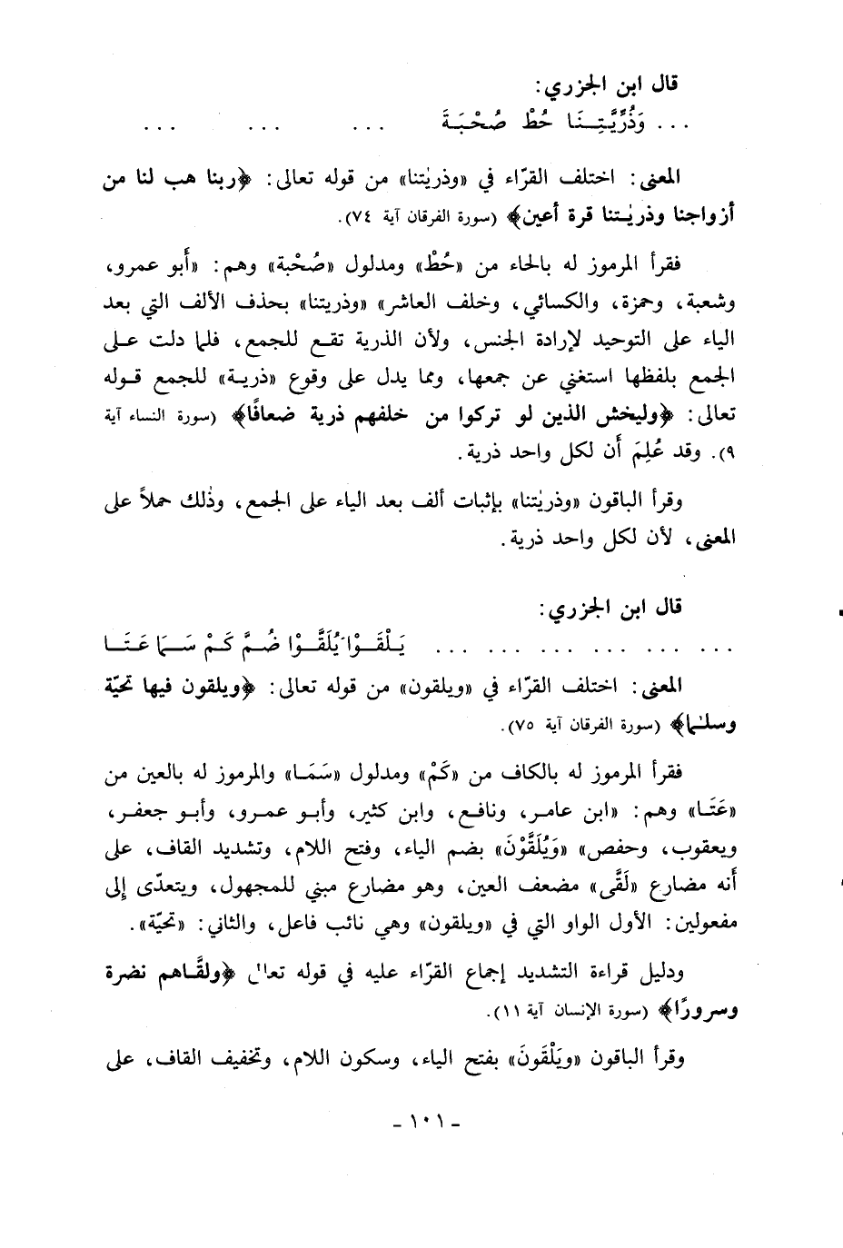 فقرأ المرموز له بالحاء من «حط» ومدلول «صحبة» وهم: «أبو عمرو، وشعبة، وحمزة، والكسائي، وخلف العاشر» «وذريتنا» بحذف الألف التي بعد الياء على التوحيد