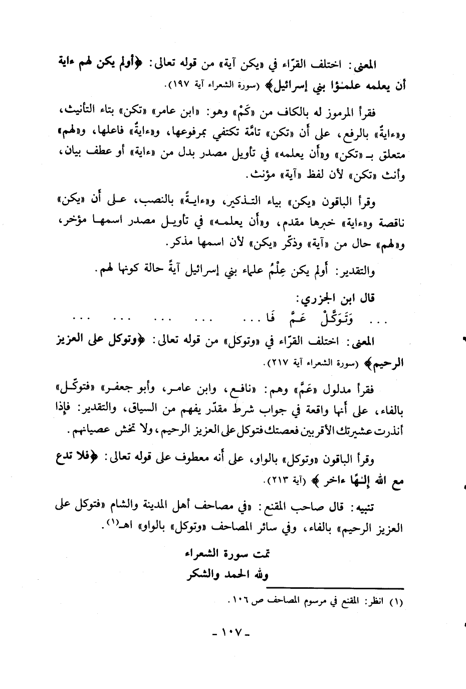 قال صاحب المقنع: «في مصاحف أهل المدينة والشام «فتوكل على العزيز الرحيم» بالفاء، وفي سائر المصاحف «وتوكل» بالواو» اهـ «1».