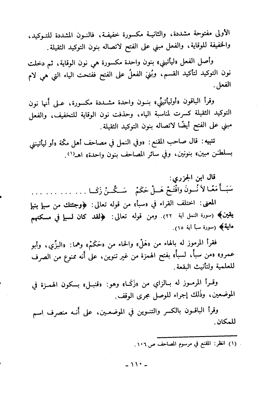قال صاحب المقنع: «وفي النمل في مصاحف أهل مكّة «أو ليأتينني بسلطان مبين» بنونين، وفي سائر المصاحف بنون واحدة» اهـ «1».